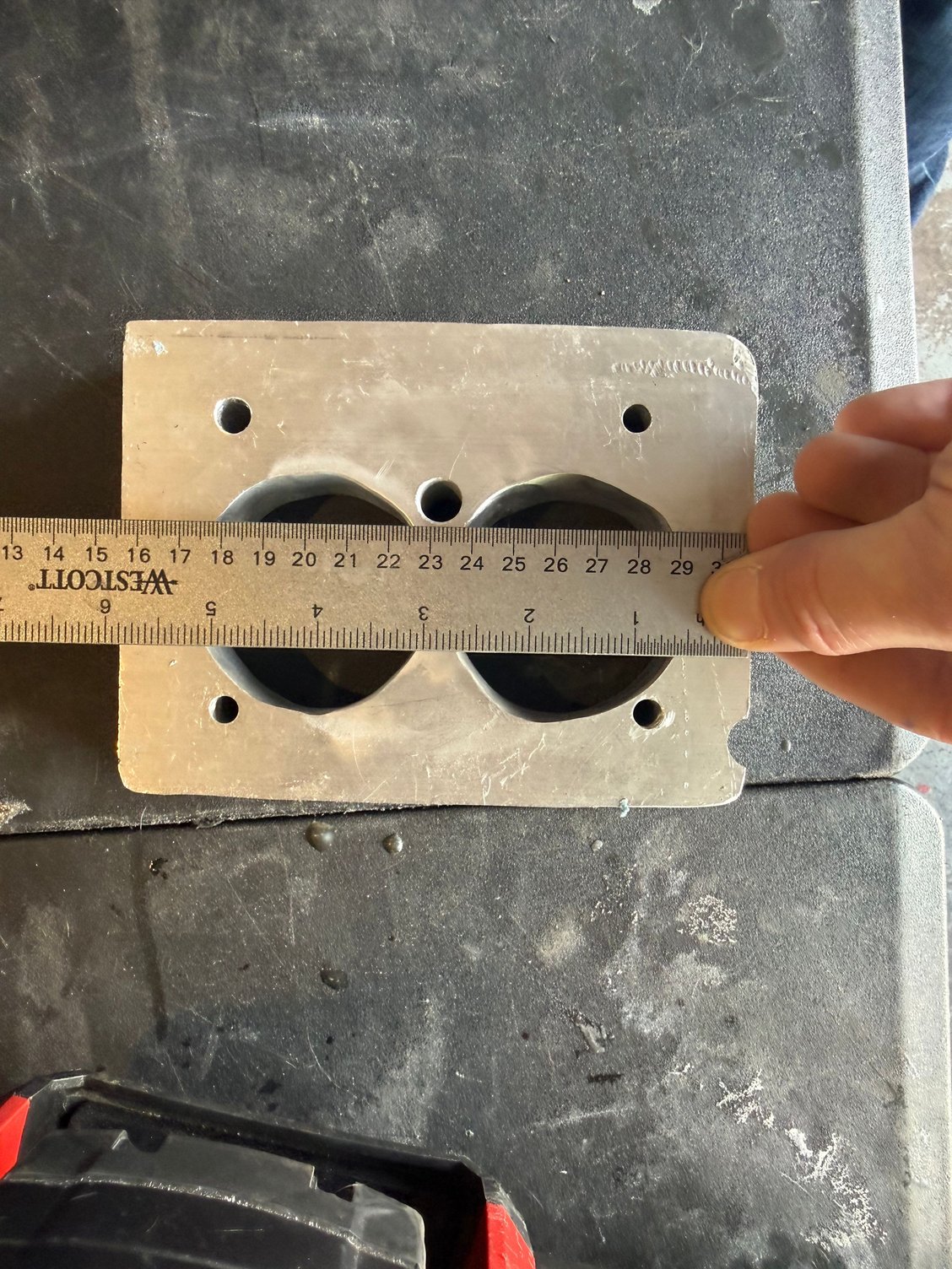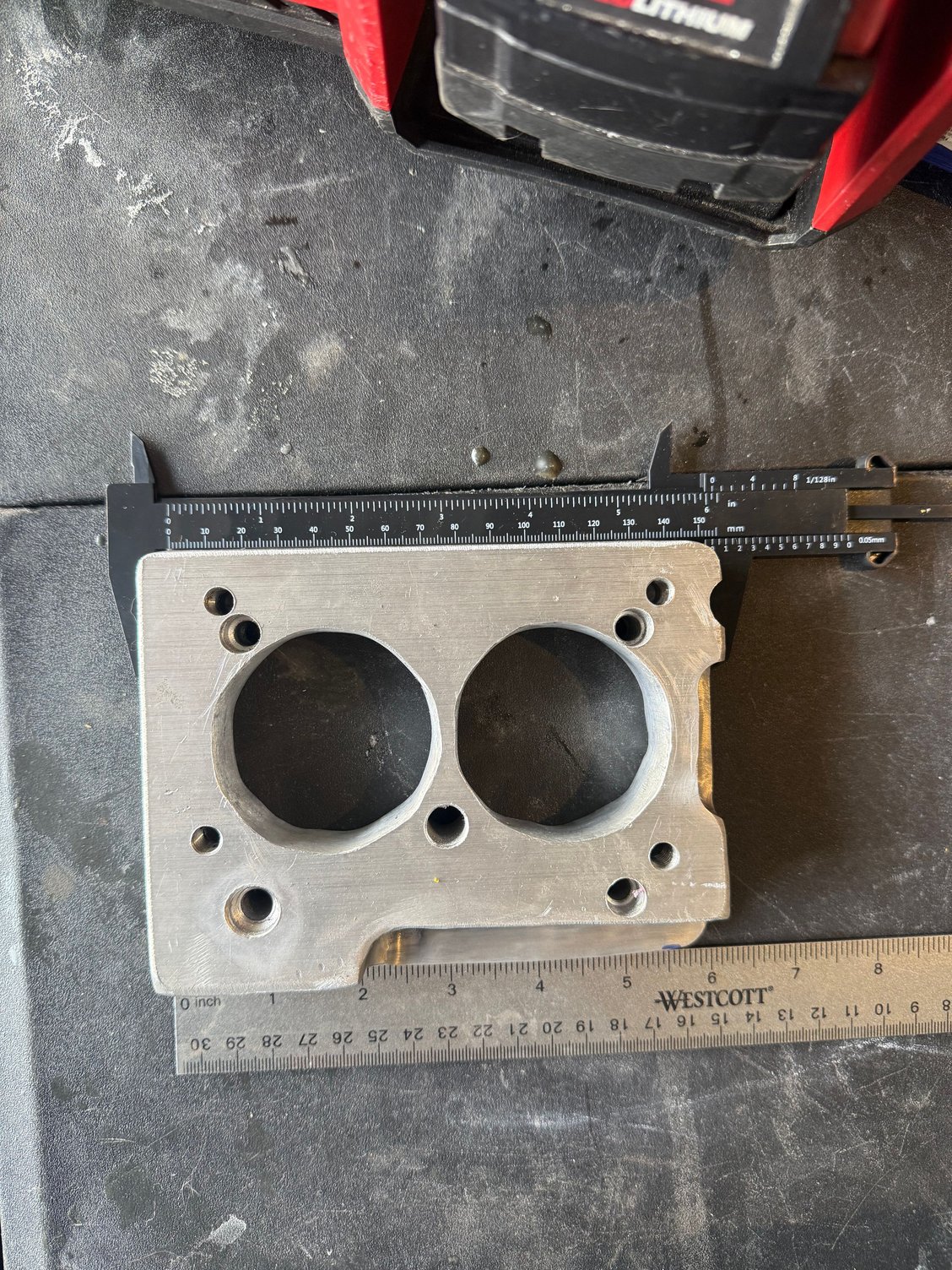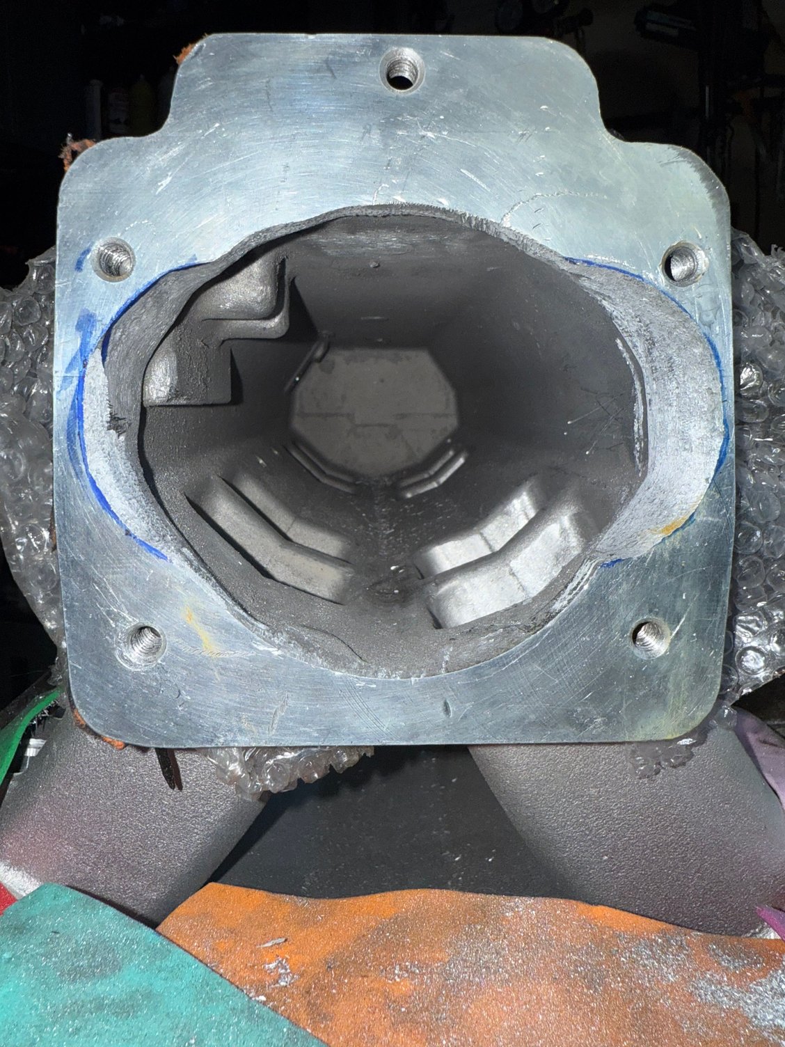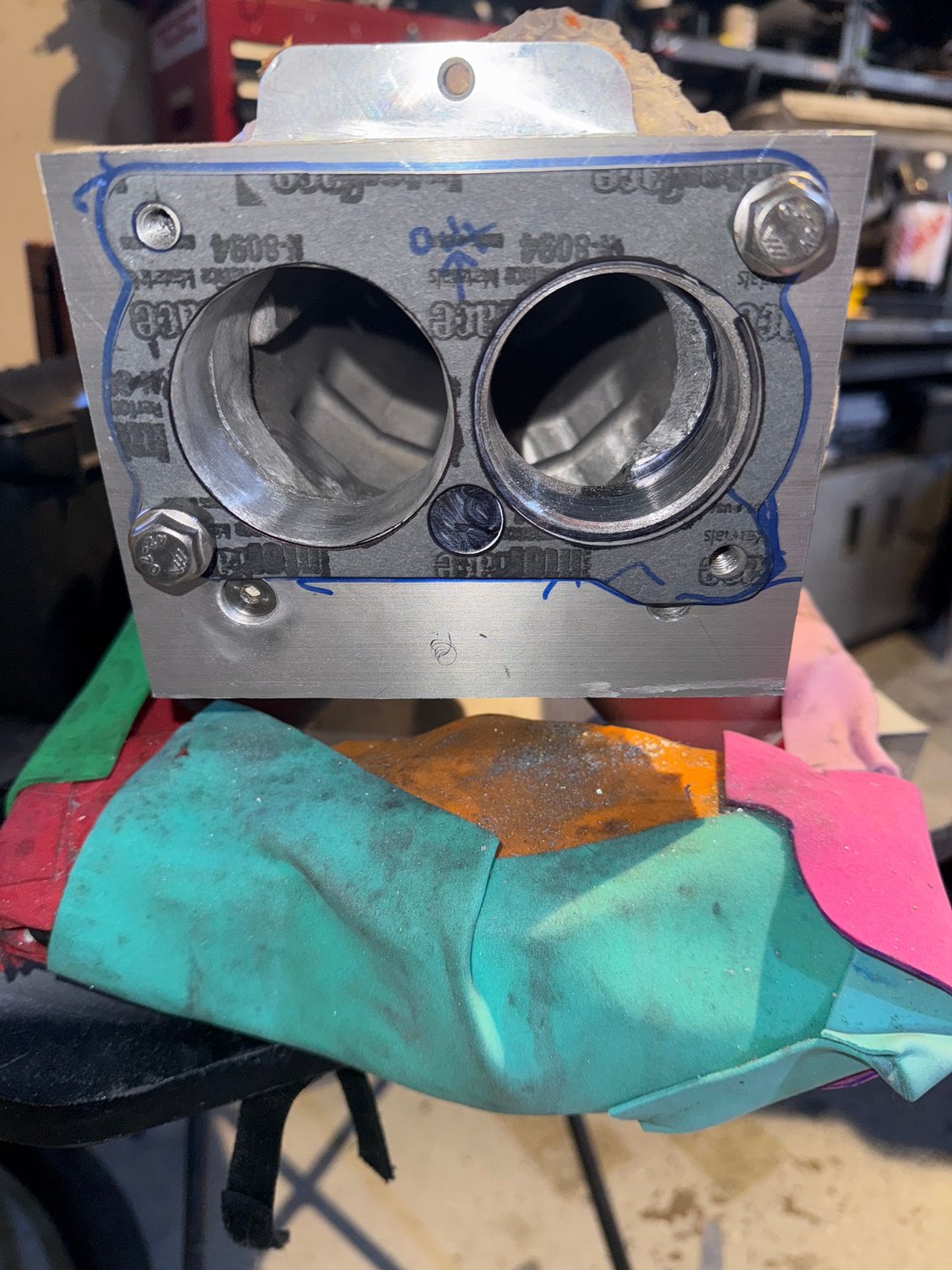 View of the 1 inch aluminum adapter plate under fabrication. Before porting overlayed with a 1205 gasket. Getting close!