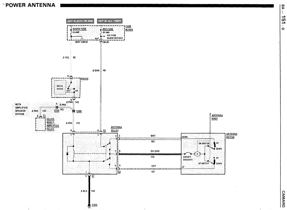 Take a look at this diagram, notice how the antenna relay always has power? That's why when the mast cable snaps it keeps running with the car off. In reality, GM, should have had a switch to disable the power antenna when not needed, situations like automatic car washes (Lot of GM vehicles had power antennas), or when not listening to AM/FM for example (Tapes & CD). Now a days its more blue tooth or some other media input. But having the capability would extend the life of what ever antenna you have. My plan/solution/future basis for a HELP thread is to simply wire in a two prong 20amp momentary toggle in the orange relay wire . This way the antenna doesn't have power unless I want it to have power, it could be defaulted to the off position.