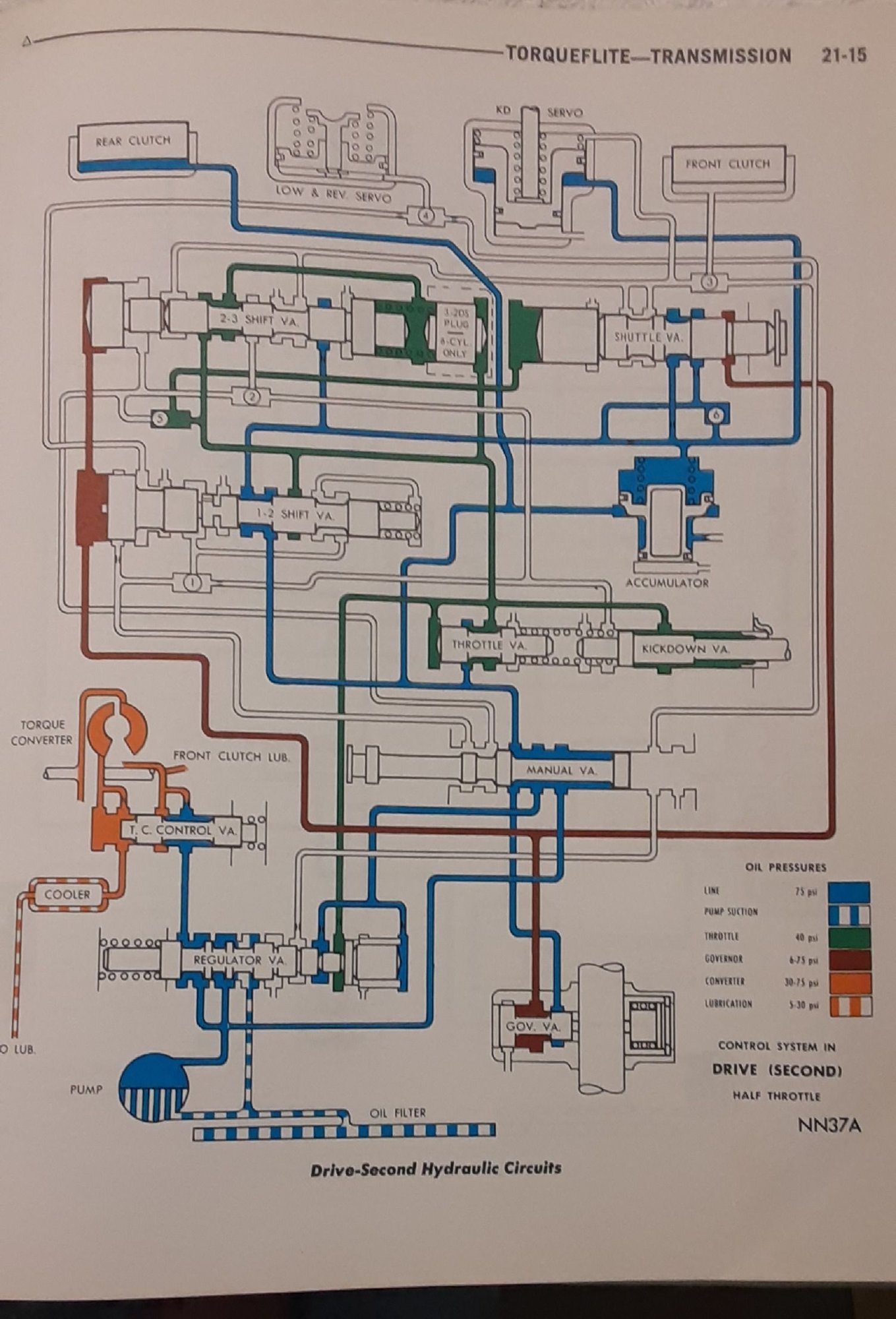 Has black and white electrical and vacuum diagrams, but color diagrams for the hydraulic circuits of the automatic transmission.