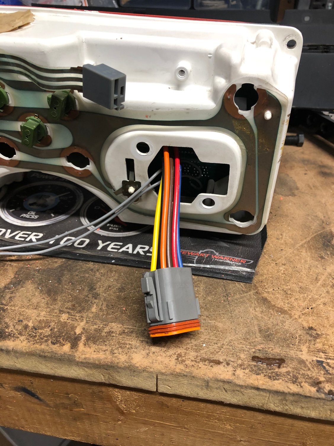 I purchased an 8-pin Deutsch connector from ebay and connected that to the Intellitronix wiring. I thought this would be a good idea in case I want to ditch these gauges for some other setup in the future. I'm doing an LS swap with 4L80E tranny and will be using an FiTech Ultimate LS EFI. The FiTech computer controls my tranny and outputs a speedo signal so I don't have to use a cable. This allows me to use the speedo hole in the cluster for the gauge connector.