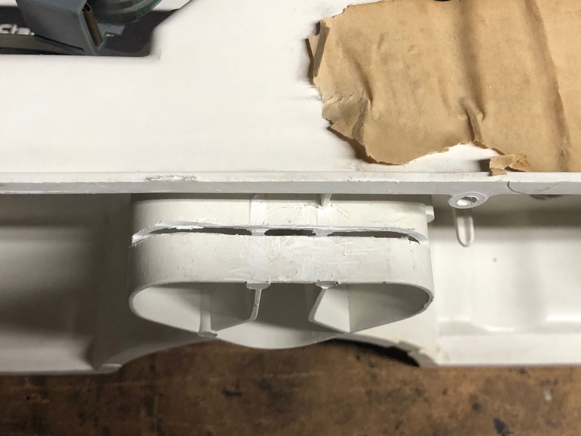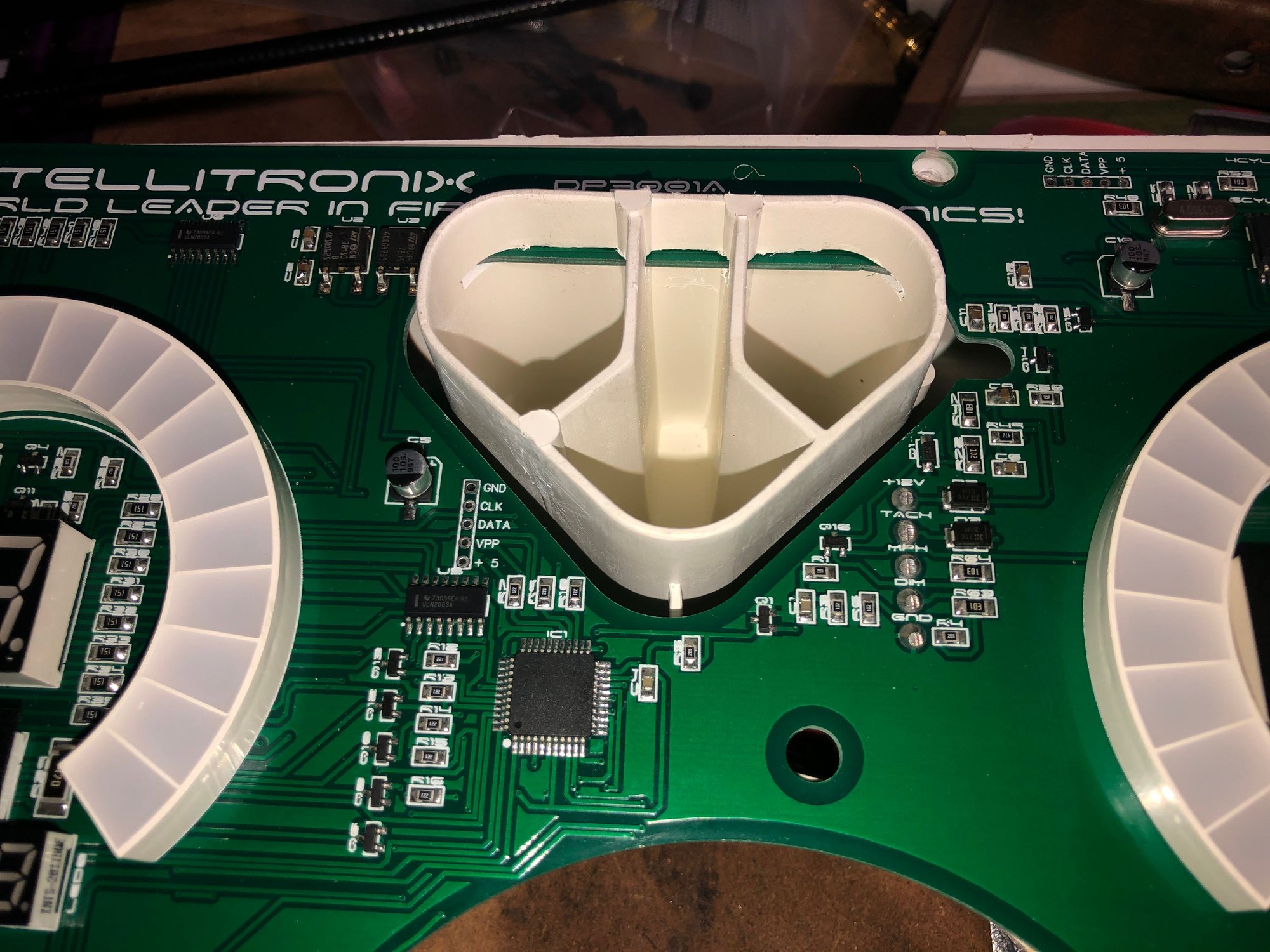 I didn't want to just go hacking up my housing so I took baby steps cutting things. I first cut off the top alignment pins. That didn't help the speedo / tach circuit board fit, but the other board was pretty close. I used a rasp bit on my Dremel at slow speed and enlarged the upper right hand screw hole slightly. Now the oil, temp, fuel and volt circuit board fits.