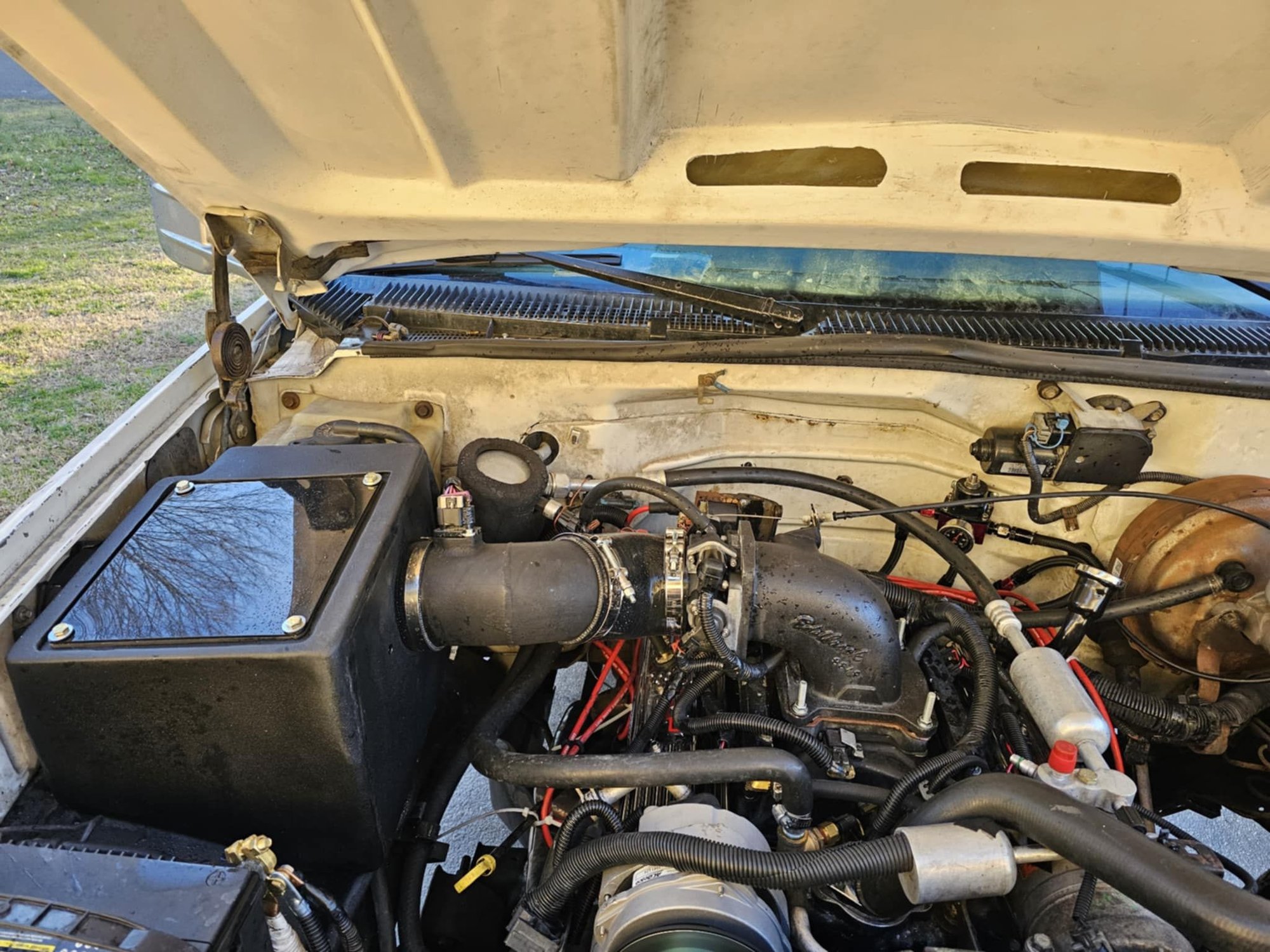Dual plane MPFI manifold, Edelbrock elbow, 92mm Fitech TB, 4" CAI using a Volant sealed airbox.