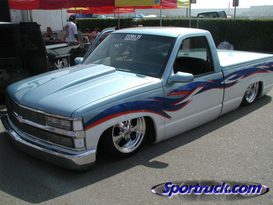The fronts of the fenders were painted silver to look like bare metal, with air brushed rivets in a line at the body panel seams. It also had small "charred" spots here and there. About at the rear of the front fenders was an air brushed fire, leading into a mix of semi classic/realistic flames down the side of the car over a base of yellow pearl.