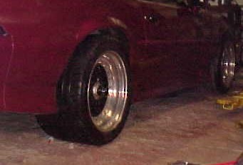 275/40/ZR17 front. My tires are Michelin Pilots. The rears sell for around $325-340 each, and about $290-300 for the front. The mods I did to fit them were about the same as CAR N DRVR's, except (I'm not sure if he did or not) I had to clearance the LCA's about 1/2" and I did not flare my outer fenderwell. These pictures are, however, outdated since I lowered the car about 2" last weekend. It really looks much meaner since it lower now. I will post new pics soon. I am also planning on taking the wheels apart (they are actually bolted together with 12-point ARP stainless steel bolts) and sanding the paint off the "ribs" of the crosslace, and polishing them. The crosslace design is actually somewhat similiar to the Boyds "Tuned" wheels, but it's hard to tell it because the center is black.