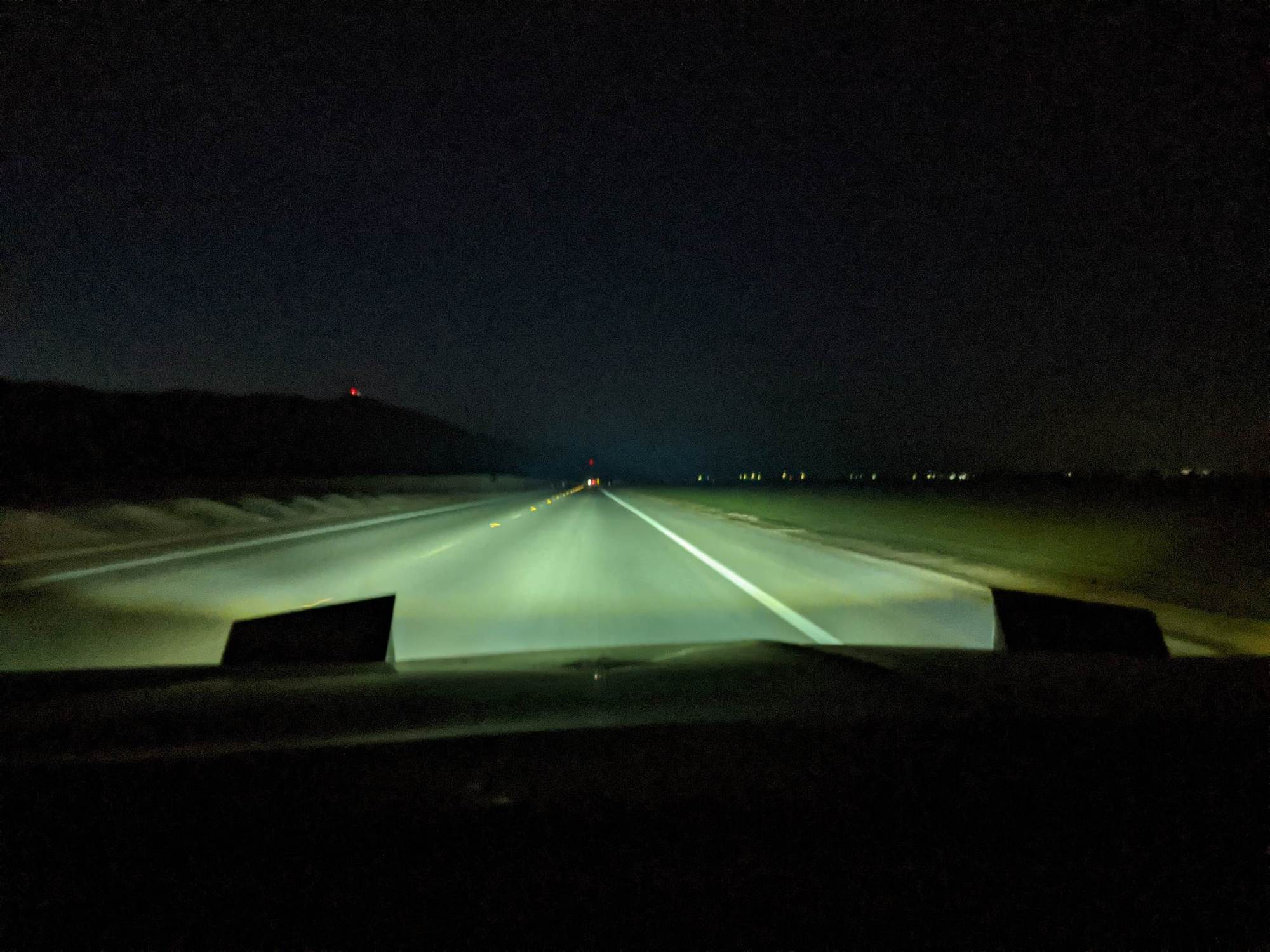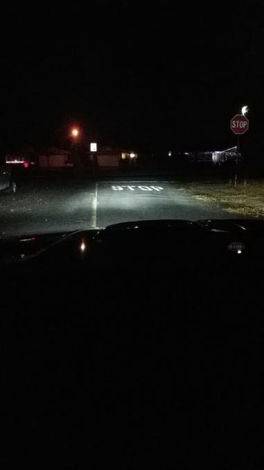So i got a picture of the lights on and the low beams , I am amazed at the wide coverage these VisionX gave me compared to my h4 bulbs so this is what the low beams look like . Last time i thought the high beams were the low beams