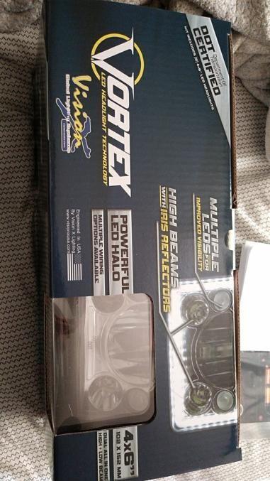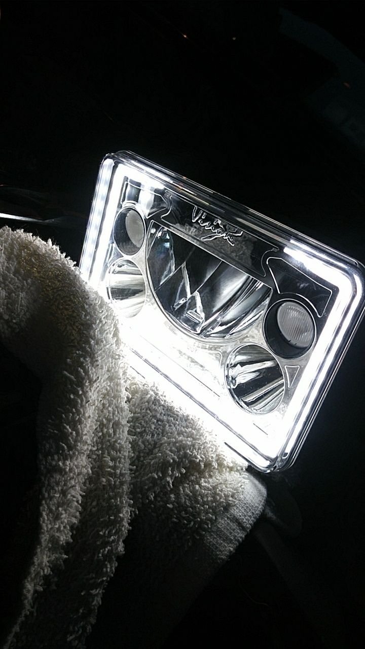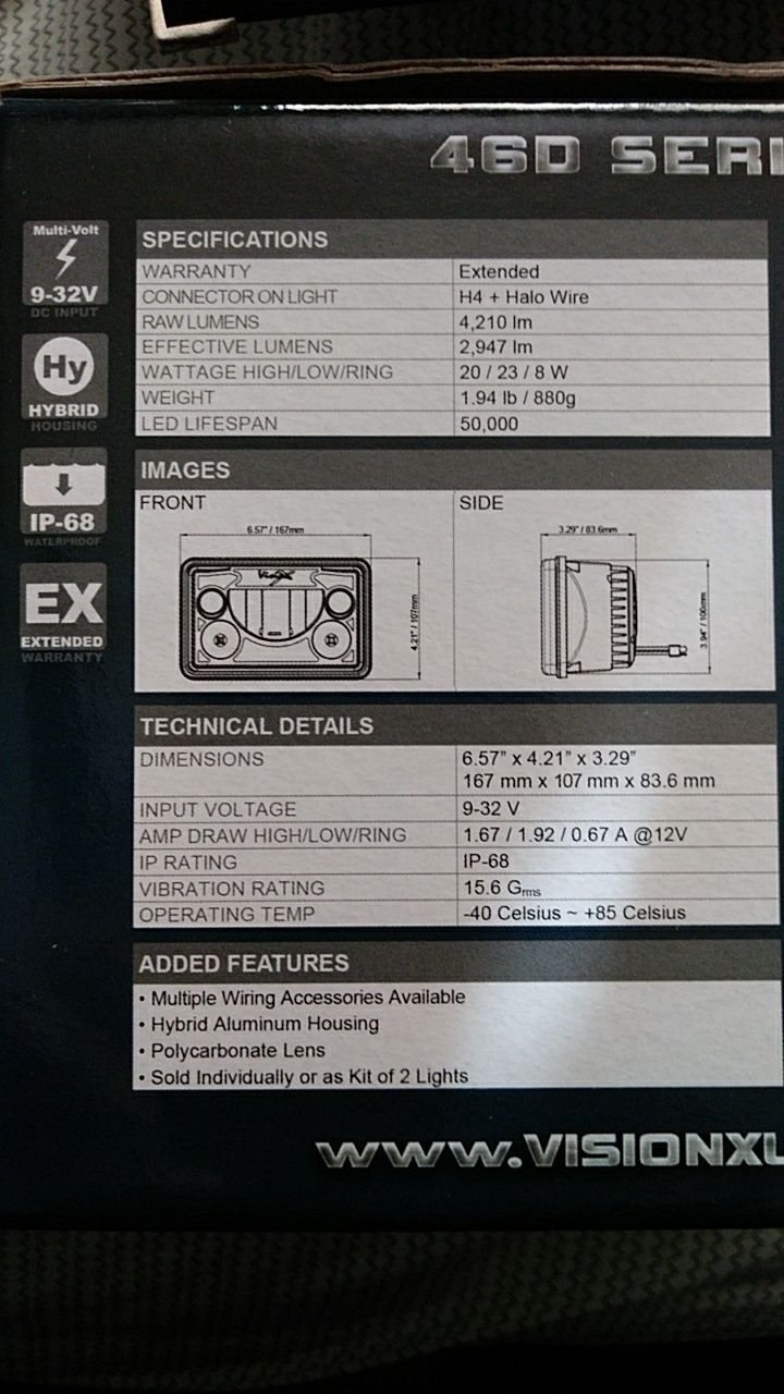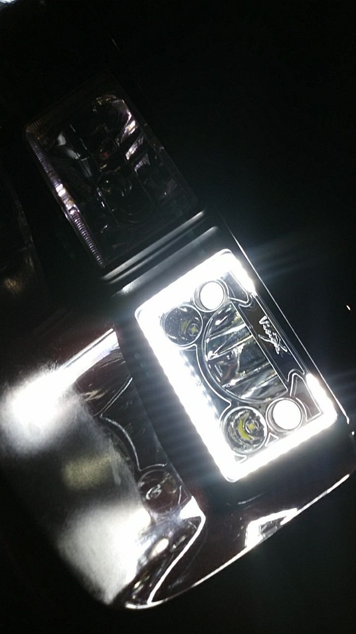 So i finally got around to installing the two VisionX 4x6 headlights i bought a month ago or so. Ill make a separate thread on the installation with pictures and what i ran into incase anyone decides to get some for their thirdgen. As for here i will post what they look like and once i make a video for how they light up on the road, i will post one up this week. I do plan to get the full set and have them all turn on together with halos, and halos+low beams/high beams . the box they came in the info on the side my previous set of healights a close up the back side . very plug and play but do have to swap the red and black wires on the headlight harness to match with the LED ones on the VisionX another rear shot comparison with my old ones on appearance The halo on. these are able to go farther in than my old ones the "halo" on the left is on from my old ones and the halo on the right is very bright and clean looking . Also has the low beams on. i had to get an angle to get a better shot without just seeing a big blur on the snapshot