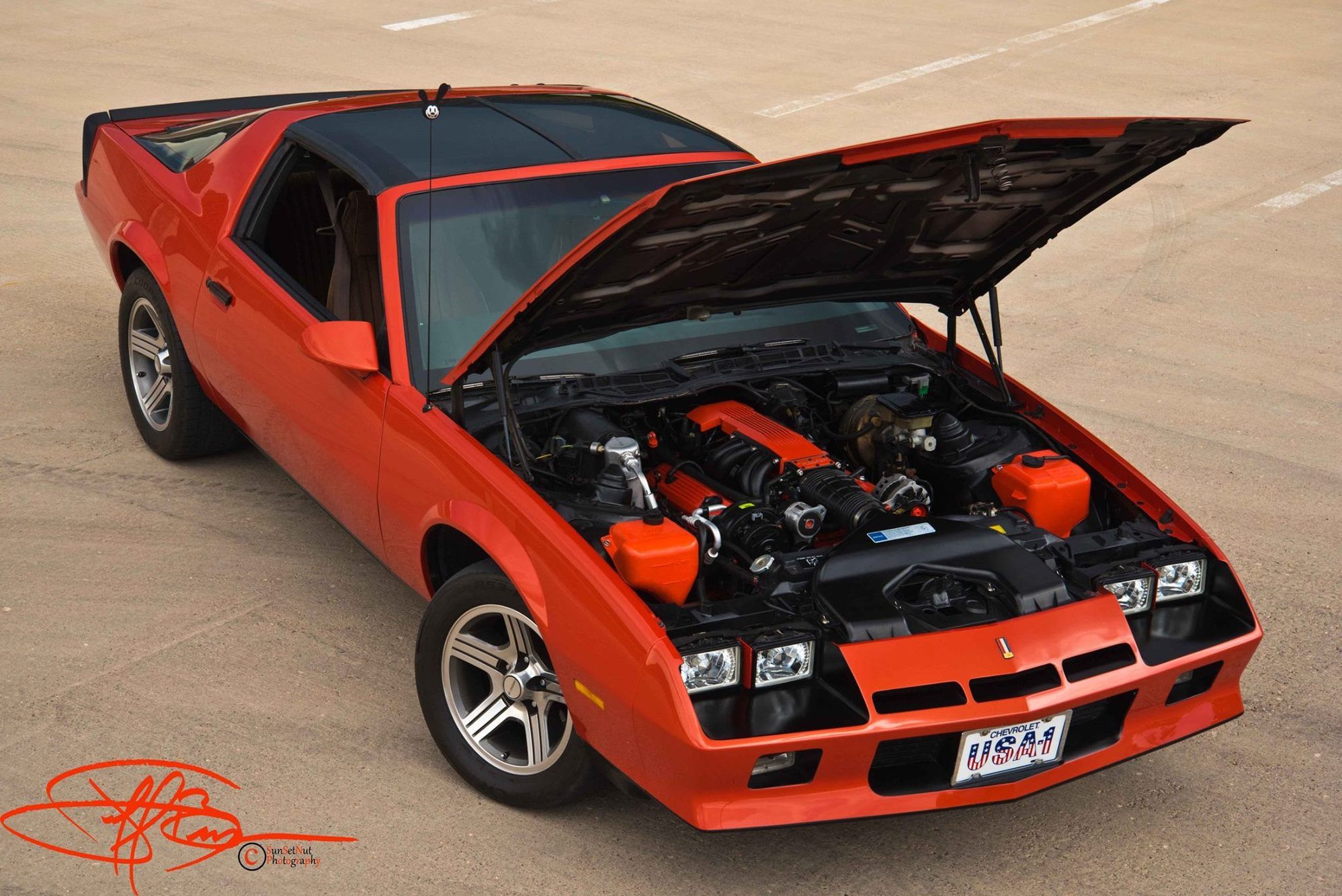I'd like to thank Abubaca for the nomination for car of the month! I have just recently gotten into the social media world exclusively for my car and having recognition like this means a lot! I got my car in 2012 and it has been an on going project ever since. It is a 1983 Camaro Berlinetta that originally had the 305 with 700r4 combo, and had every option that was available in 1983 including a rear windshield wiper and t tops. Since 2012 I have made huge changes to my car it was originally Light Brown Metallic with dark brown accents with wire basket wheels. Now it is Inferno Orange Metallic with matte black accents and my personally refinished IROC wheels. The second major thing that I did to my car was the 350 TPI swap. I completely rebuilt an engine out of a 1985 Corvette over the course of about a year, then took a months time to complete the install... Sadly after about 6 months it blew up on me about 4 hours from home. That was an extremely long tow truck ride home. But I did not let it get me down, I went on the hunt for a later TPI with a roller cam, and I stumbled across an engine out of a 1987 Corvette with factory aluminum 113 heads that would serve as my replacement. After about 4 months of waiting I finally got the engine installed and the car going driving down the road again! The third thing that I did was replace the old 3.08 open drum rear end with a borg warner 9 bolt with disc brakes and posi! That was a huge improvement over the open diff and that I could burn up both tires equally rather having the one tire fire. Last but not least the transmission swap, I got a WCT5 out of a friends car and took a weekend to give my car a huge upgrade in the driving experience. My car is a project that never ends, I'm sure I will find something new to do with it soon enough...