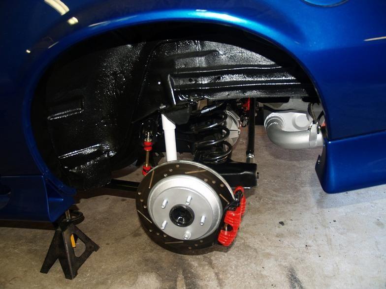 The rear differential is out of a 97 Camaro with 3.42 gears and a posi unit. PBR calipers, UMI control arms and adjustable panhard bar. Yukon aluminum differential cover with bearing supports. The front end has UMI lower tubular A arms, BAER brakes. Eibach pro line springs, cross drilled and slotted rotors on all four wheels. KYB struts and shocks. JEGS subframe connectors. All suspension components upgraded to Energy Suspension.