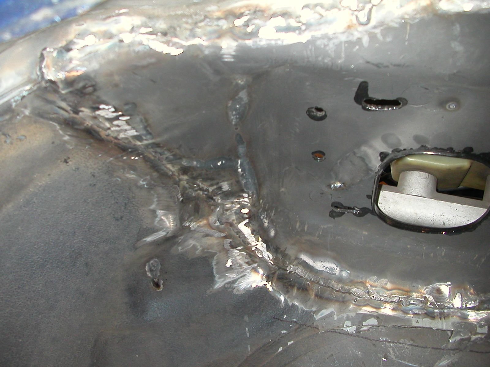 My first thought was the car had been wrecked and this area heated and reshaped, but doubt it could or would have happened like this. I'd guess a bad piece of steel from the mill. Looks like a tricky repair, hope it turns out good.