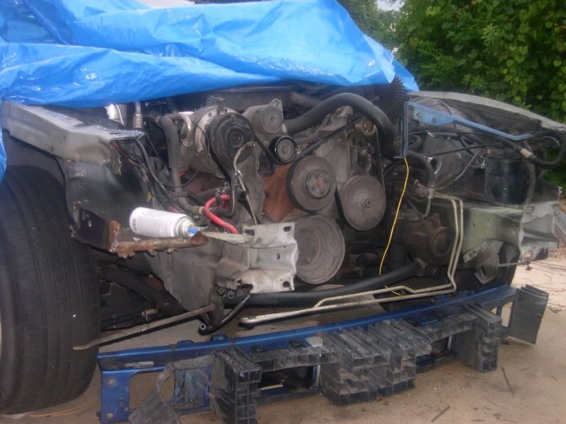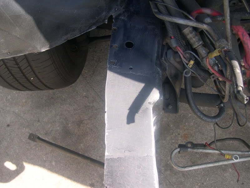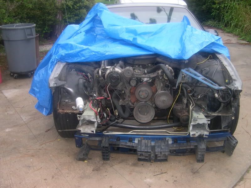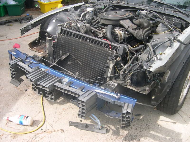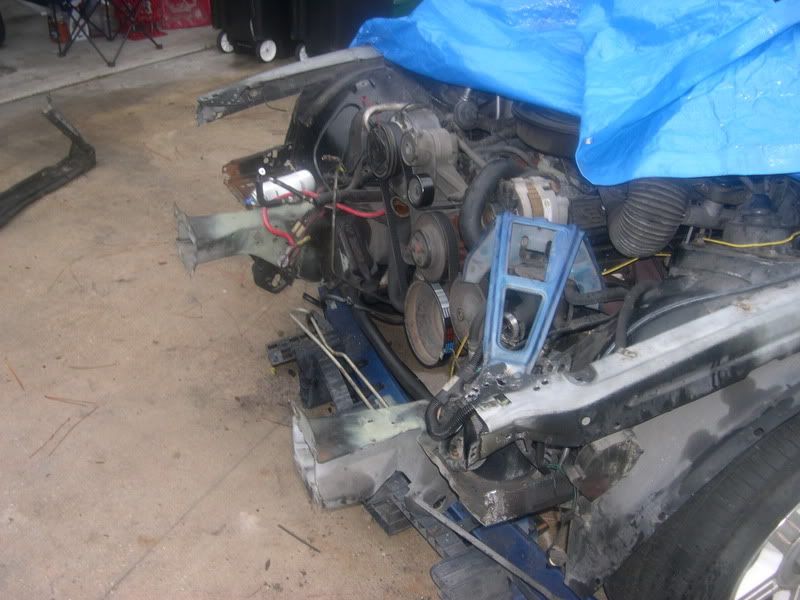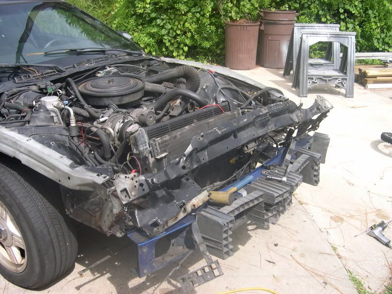 Well time for an update. I started hammering away at the front end yesterday nice...drilling out all the noticeable spot welds..then worked on it for about 2 1/2 hours today and finally got the bitch off. If you plan on doing this...air tools are god, especially a good air chisel. 50% of the time you wont drill out the spot welds perfectly and thats where a good air chisel comes in handy..it will free the panel with no problems. For a first time do'er i'd say it came out damn near perfect..the driver side gave me some trouble and i cut up some pieces a bit much but nothing a small weld couldn't fix. I would just like to state here i am 19 and have no unibody repair experience, I have done some body work..but nothing that involved cutting the frame of the car..but i will always dive head first into the unknown if it means im going to learn something knew. If i can do this then YOU can too..