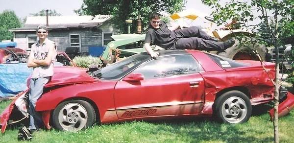 I know this car isn't a third gen, but here is a pic of my old 94 Firebird after i wrecked it. This accident took place back in '02. Just thought i would post it up here. So here is what happened. I was out late one night headed home, and i didn't notice a stop light ahead of me change until it was to late. I got t-boned by a full size Chevy van, and spun around twice burying the front of the car in the stoplight pole. As you can see the damage to the outside was pretty extensive. In side i busted the drivers door panel with my shoulder, and my buddy that was with me obliterated the center console. The air bags never did employ thankfully so my nose was saved, and we both walked away with some bruises. I know we all hate to see our cars damaged or destroyed, but what has happened to some of you guys. I am the one standing in the front of the 'bird, and that is my buddy that was with me doing his sexy pose on the roof. By the way he got burned while taking this picture cause it was like 110 that day lol.