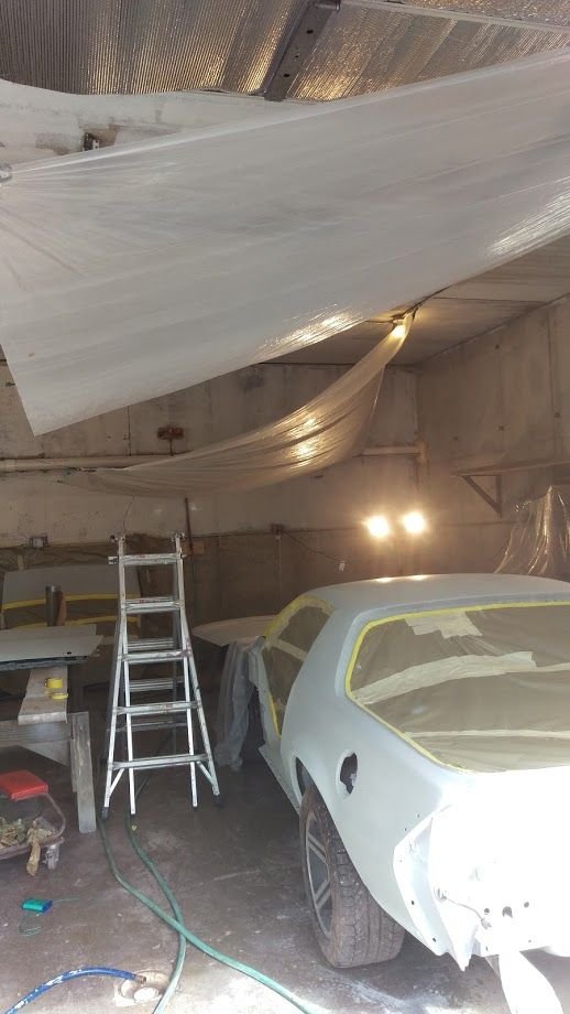 Sunday was a clean up day. I pulled all of the paper off the car as it will be retaped next weekend. I don't want any sanding dust under the tape to come out when I spray red. I took the pressure washer, and pressure washed the ceiling, walls and floor. Despite being vacuumed, it was still covered in red paint dust! I let it dry out, and i hit the upper half and ceiling with white dry-loc paint. One to prevent moisture from coming in through the concrete walls, and two to help reflect light off it.
