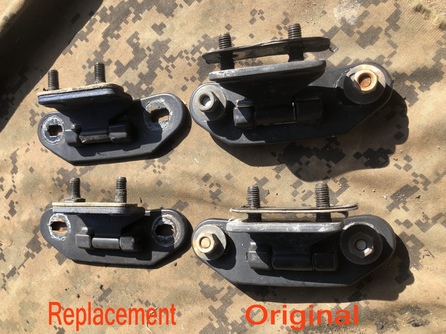 On my first attempt I used the replacement hinges with the spacer shown on them AND installed the spacer that was installed on the original hinges. ( the overhang was pretty significant & I thought I'd need a LOT of adjustment. ) The only reason for using the replacement hinges was because the original Urethane still sealed the thick spacer on it well - the thick spacer was well 'seated" on both hinges. When both spacers were used ( thick + thin ) the hatch adjustment was TOO GREAT causing the deck-lid to be a bit "short" of the body. My second attempt was to remove the thin ( original ) spacer and just use the replacement hinge with the thick spacer that was already on it ( as shown in the pic ). The results are shown in my post above.