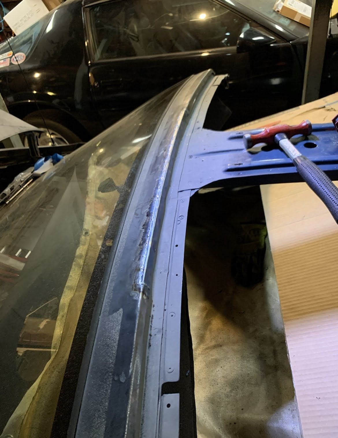Here's the only couple pictures I have with the new channels welded in. As you can see the car is in a different garage now. I finally have it back in my possession to work on Additional angle. the car needed a decent amount more filler than is pictured here After three years, the t top section is finally sealed with epoxy primer
