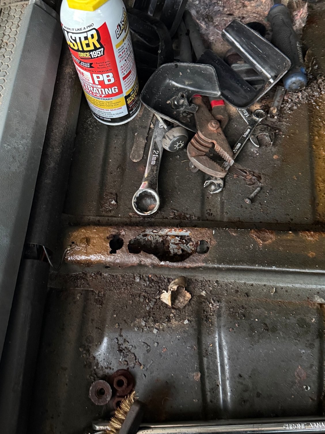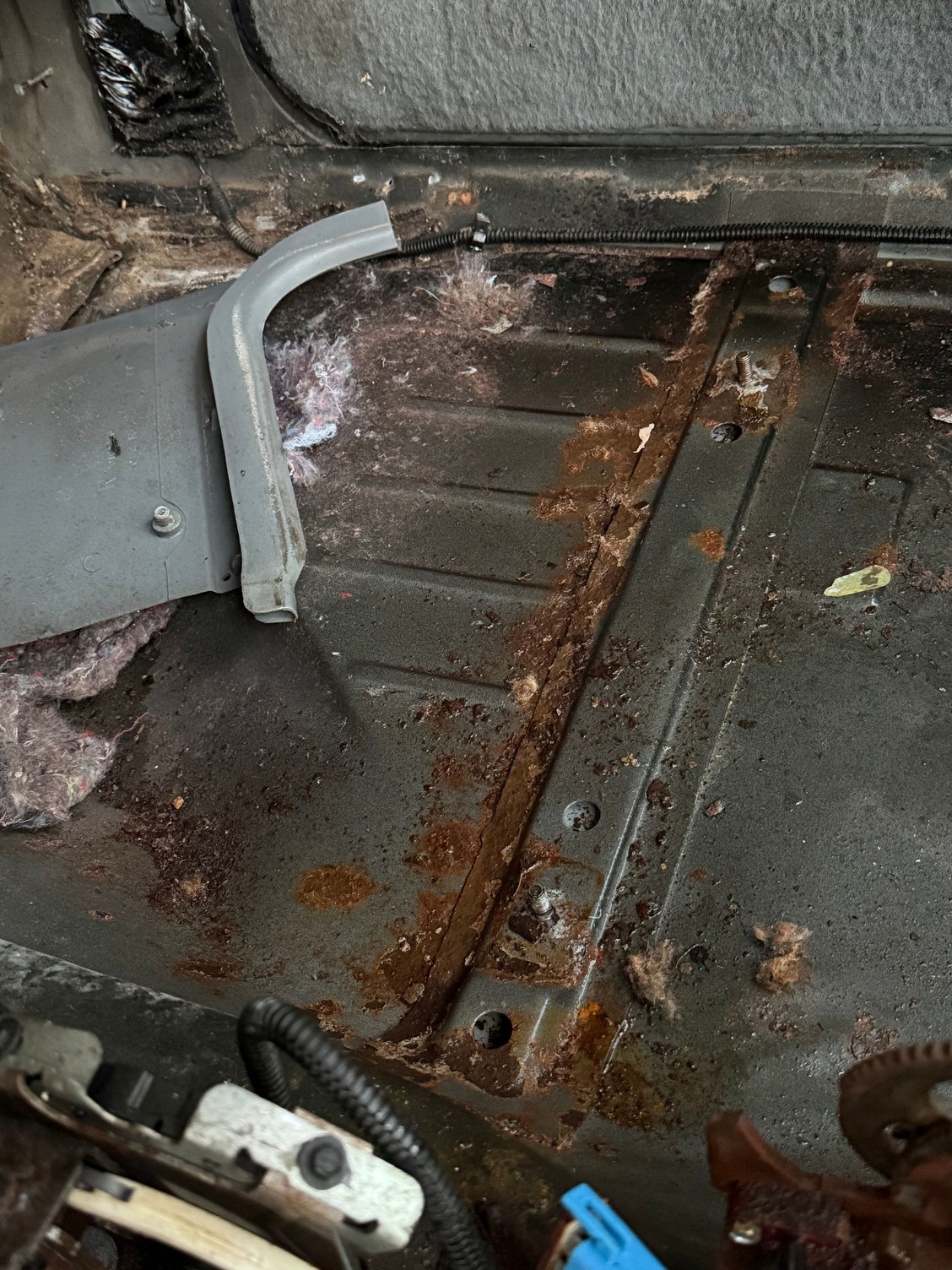 Ok, finally got the carpet out today. I’m finding some very small areas of rust and some holes. The patches of rust that don’t have holes, I’m killing with evapo-rust and brushing with a wire brush. For the hole… I guess that I’ll have to prepare to cut and patch weld them? I only spot I found that had the biggest hole so far is further up the floor, probably up near the petals (there’s some kind of rubber mat that was there that I hadn’t removed) I found it from under the car (last picture). My most important question though is to see if anyone knows if there’s a website that sells the seat mounting brackets? I’m hoping there is or someone has one they are willing to sell. I don’t have very many junkyards around me and I’m sure that the ones that are around won’t have third gen Camaros in them. Any advice, tips, and suggestions would be very appreciated! Thanks in advance!