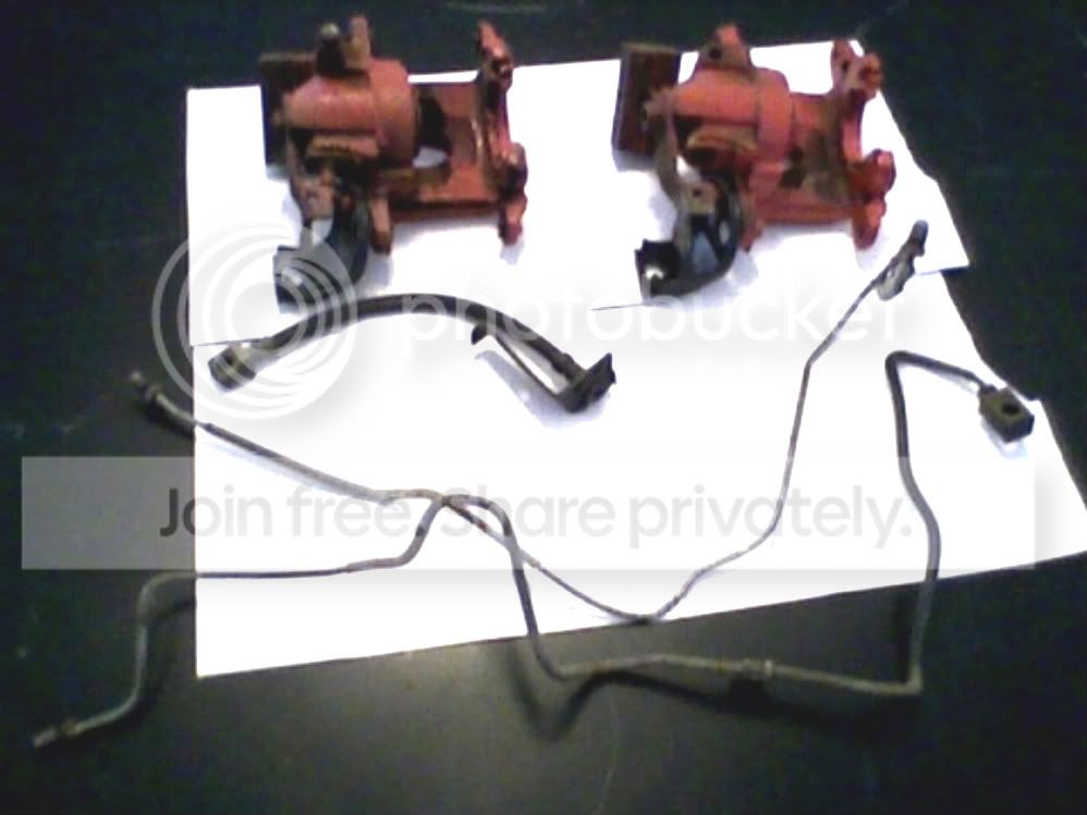 When I purchased the '91 Formula a few months back, the numb-nut who owned it before me decided to remove the rear calipers, along with the brake lines. Now, the steel line coming from the proportioning valve, to the rearend (where it normally splices into two), is still there, but it's capped of course to allow for the car to stop. Now, I do have the pieces that he so generously gave me when I bought the car (they were in the trunk), but before I get down under, can some of you guys let me know if this is everything, or is something missing. Now, I do have new brake pads, and the only other thing missing that I'm aware of are the bolts (caliper bolts, etc) to bolt everything together, but as far as everything else though, what do you see that might be missing from the picture. Thanks guys....