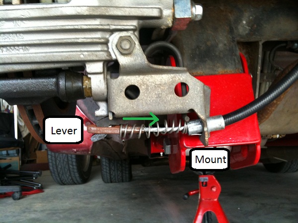 When the lever is pulled toward the mount, it pushes on a pin that is attached to the bracket that holds the inside brake pad. This pushes the pad out and applies pressure to the rotor. The lever should move enough that the pad is firmly pressed against the rotor and you cannot turn the rotor by hand/with a cheater bar. The length it travels varies.(depending on pad condition and the adjustment in the transmission tunnel/at the cabin lever).