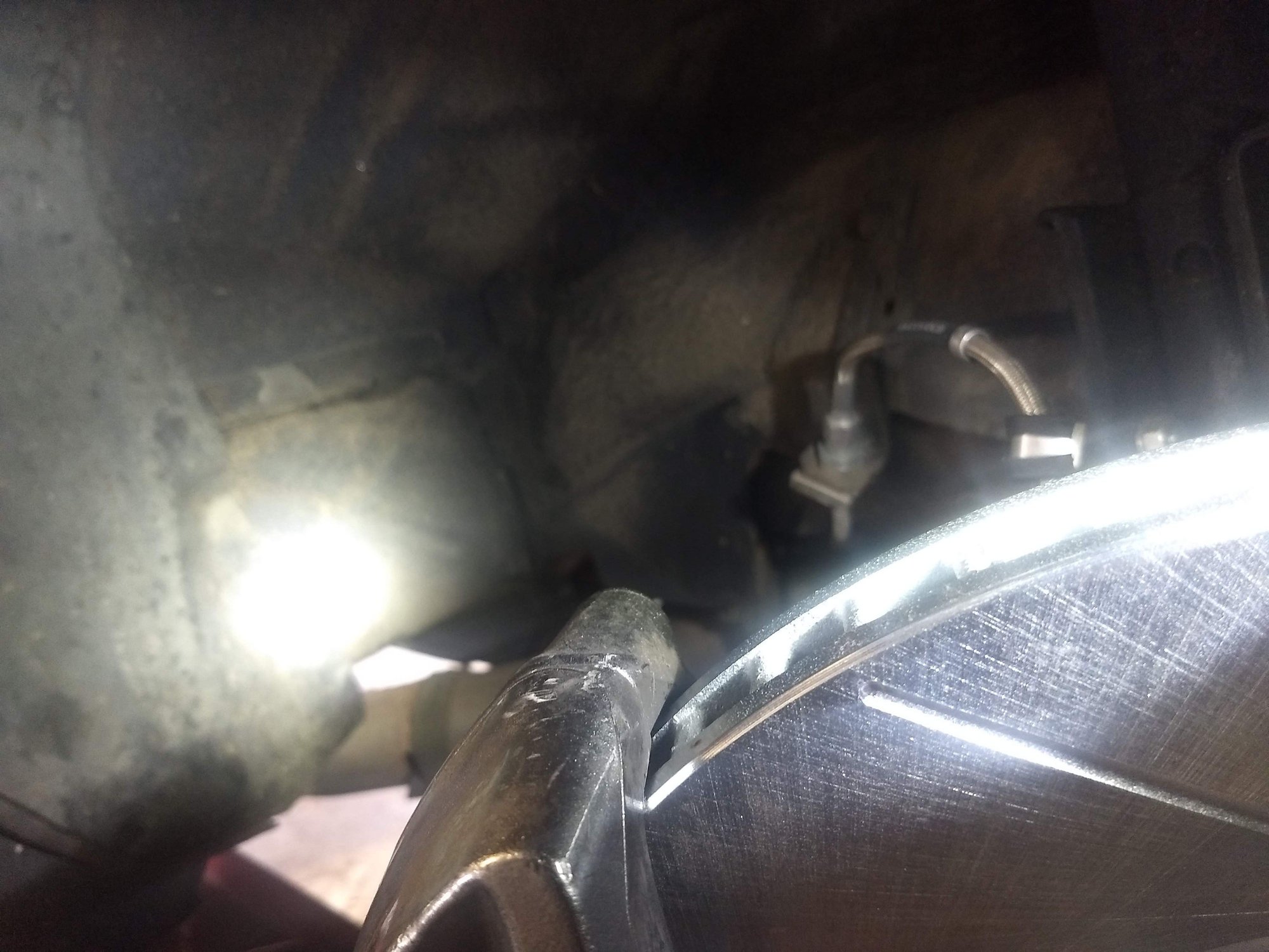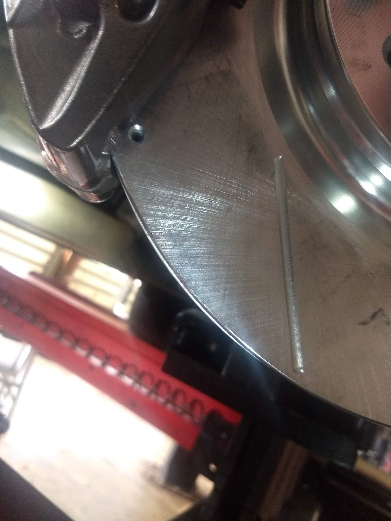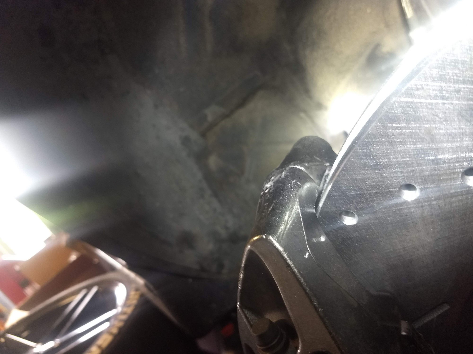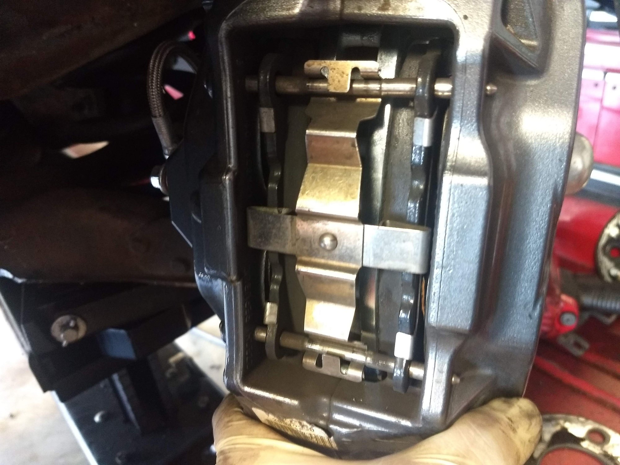 Here you can see the result of the rotors rubbing the calipers. Visually it's not too bad, but hearing the scraping at low speeds during cornering was annoying as hell, and I knew damage was being done. Focus on the bottom bolt holes of each caliper. After research done here on TGO, I decided on a TrueTrac carrier to eliminate this rubbing issue.