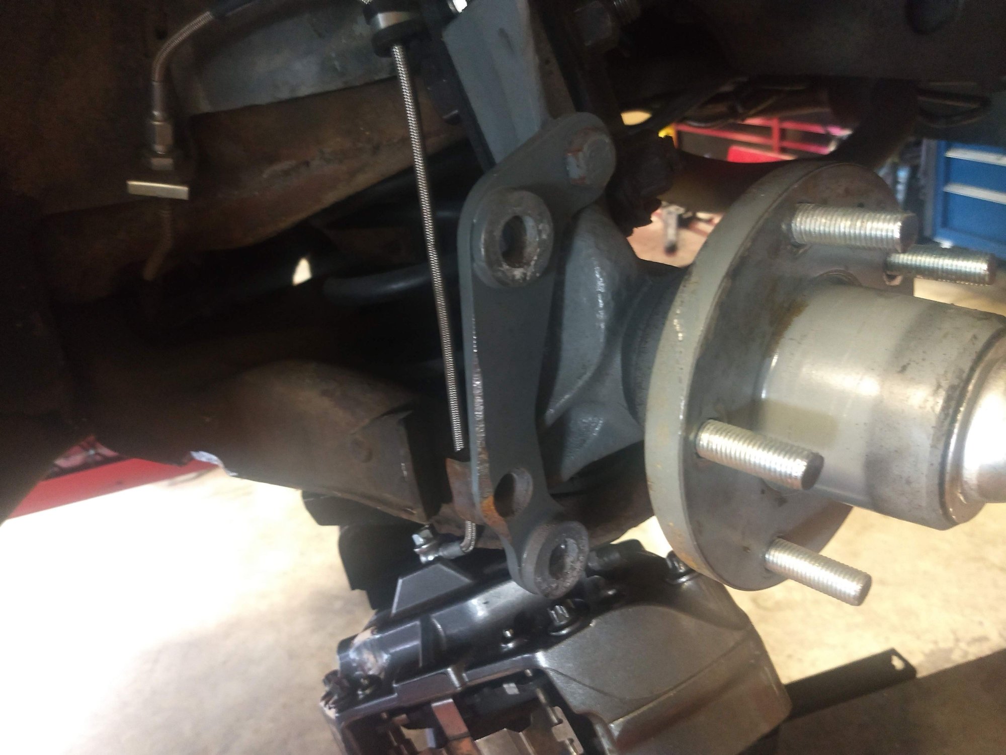 The old bracket had a bolt mounted at the front, which was removed when I took the pic. I drilled the threads out of the spindle with a 1/2" drill bit in order to mount the bolts from the rear. I asked Scott to thread the bracket for this purpose.