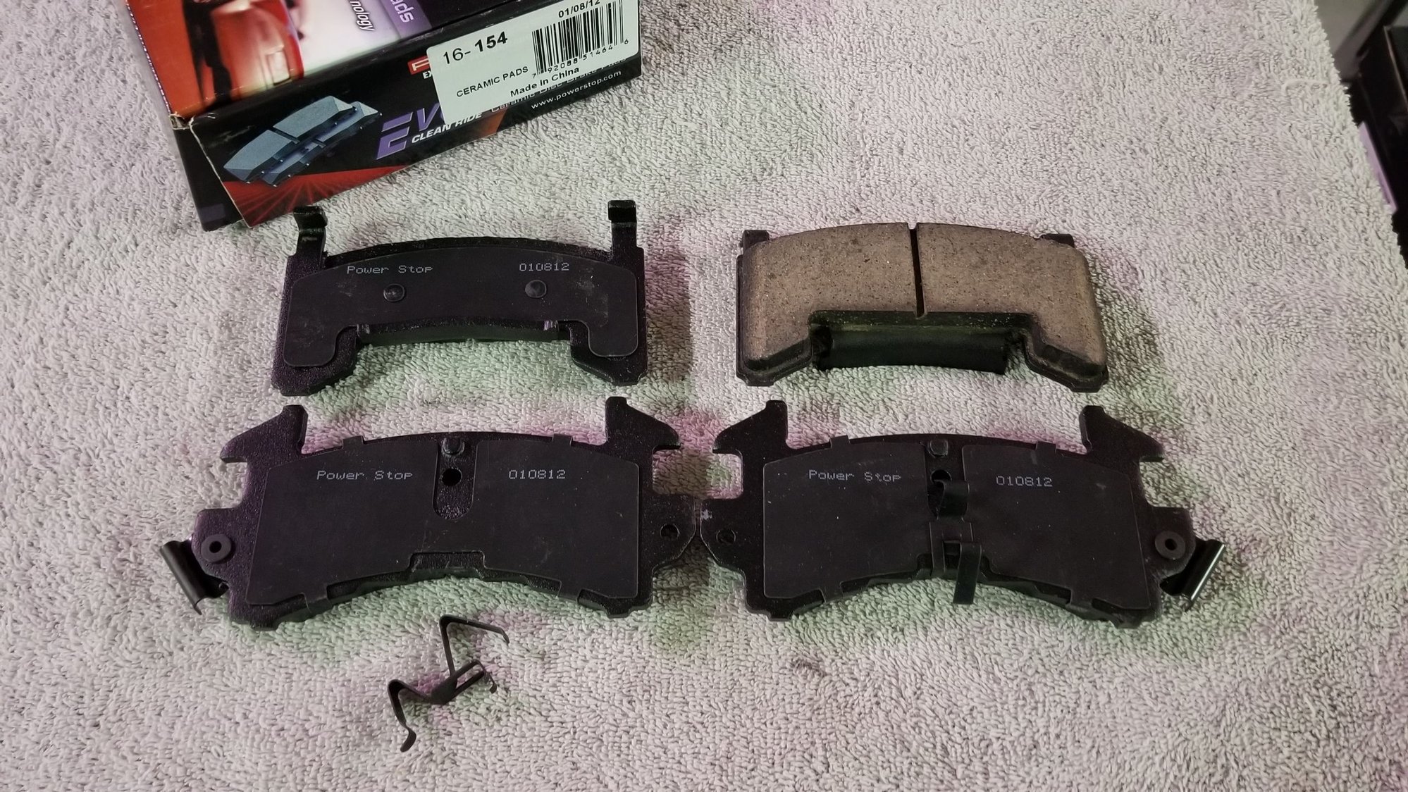 Sounds like Davey has Power Stop Z23-154 Carbon Ceramic "low dust" pads, which is its midgrade pad--154 being for our brakes. PS' top-of-the-line pad for us is Z26-154 Carbon Fiber Ceramic, also "low dust." And pictured below is PS' base/lowest dust pad, Z16-154 Ceramic, shown with the clip detached for use on the rear: