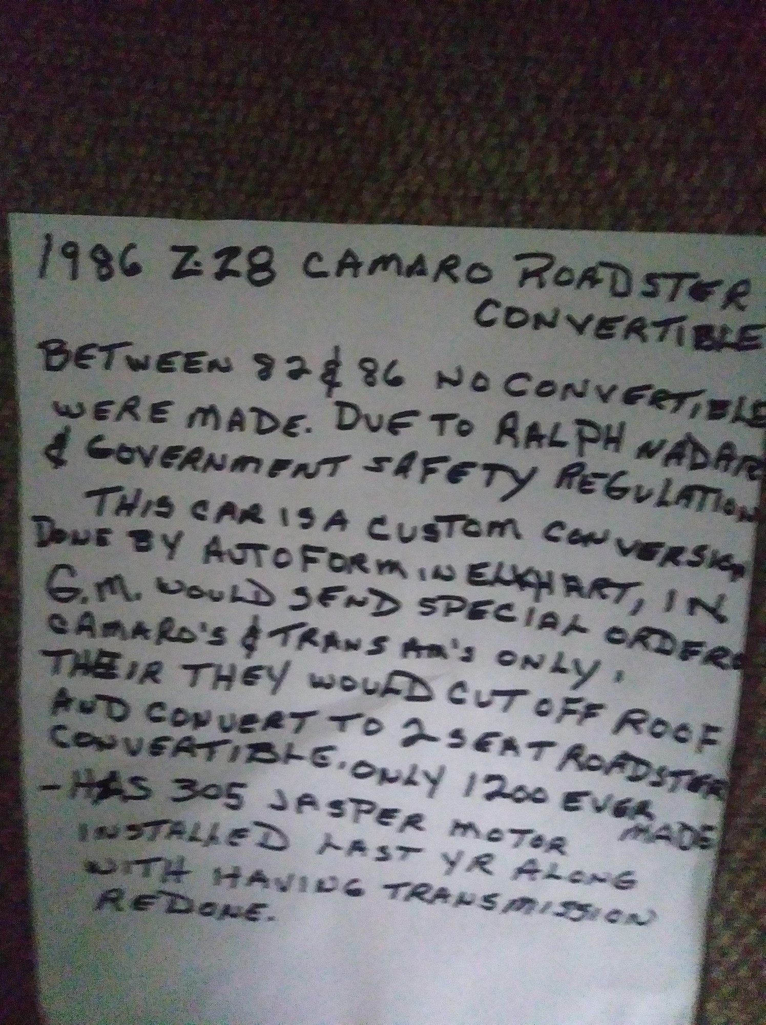 I have an 86 Z28 conversion to a roadster clean body no rust clean interior no tears very good shape runs good good tires if interested get back to me