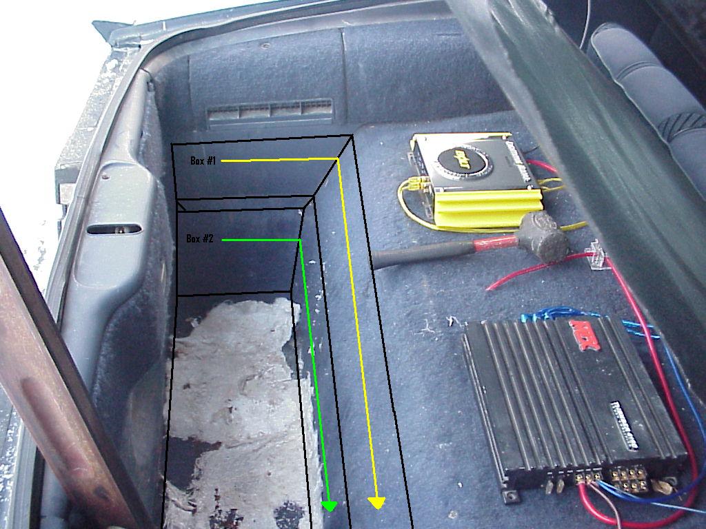 Does anyone knoe the dimensions or hte space in the trunk? I am going to build a custom box and i just wanted to know if anyone has exact measurements that i can compare to to be safe. And would should i look for in making hte box? any specific design for better sound? I dont know anything about this... my first time, any kind of tips will work. I plan on having two 12 inch subs in this box.