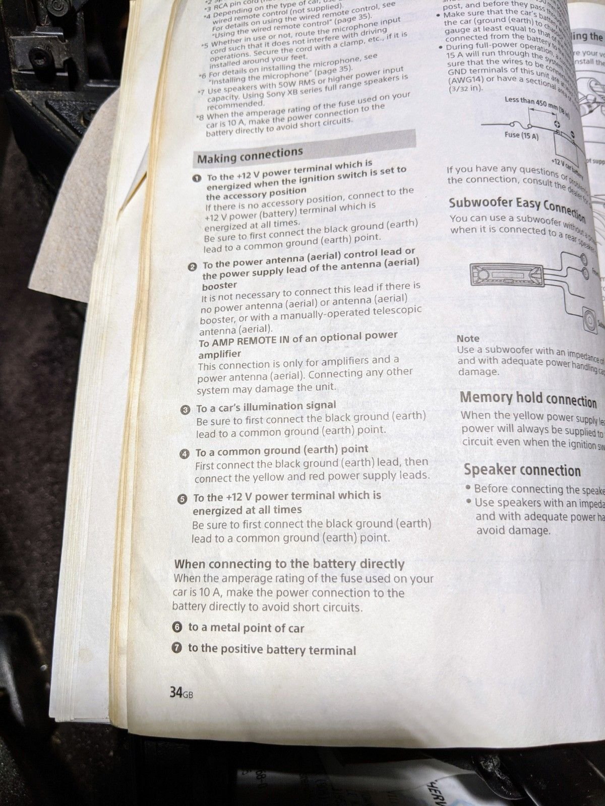 What I did originally was connect the deck's yellow power source wire directly to the car battery, as seen in this photo. This seemed to be Sony's recommendation in the installation instructions, which aren't of much help.