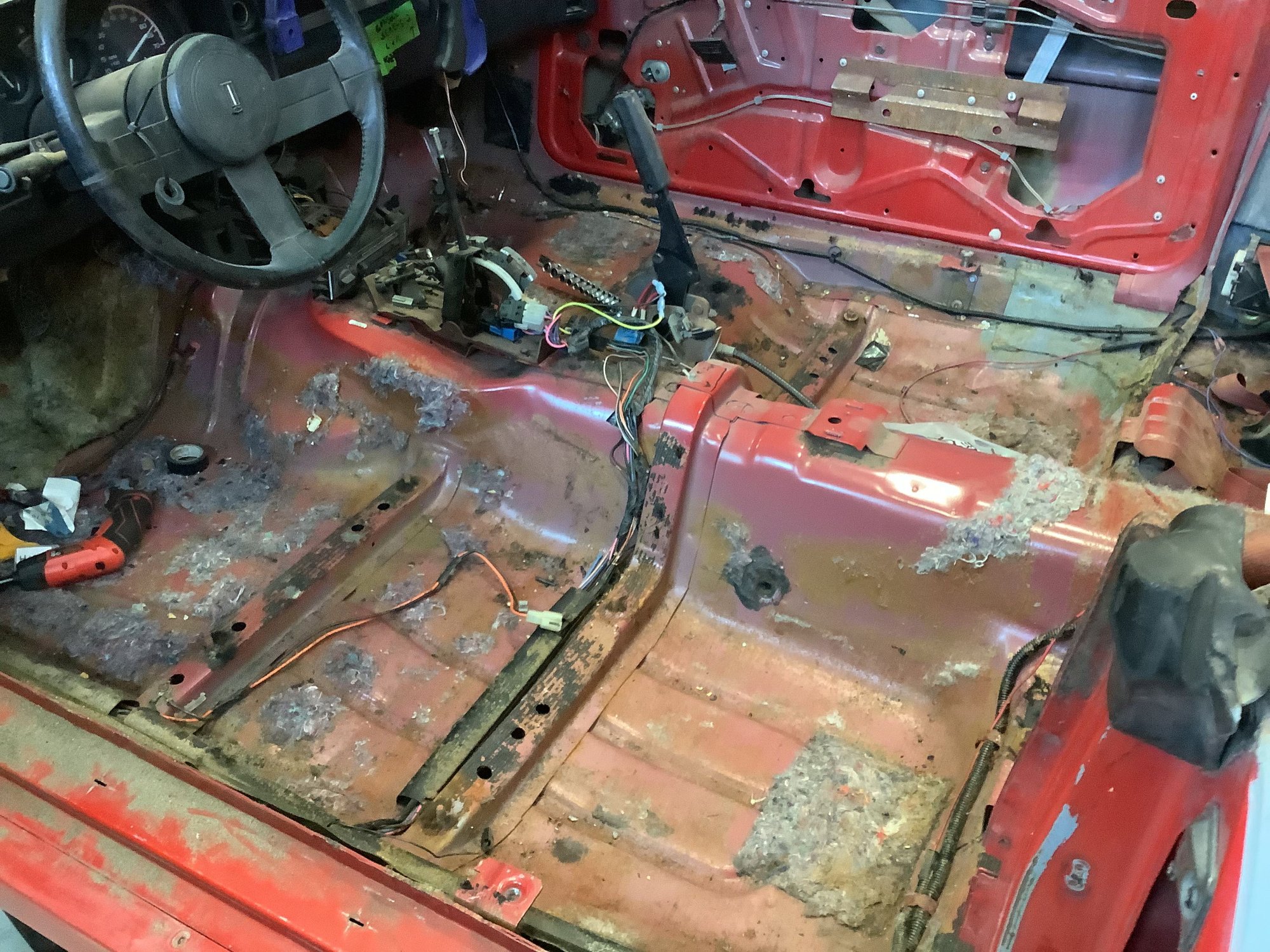You can see the white RCA cables, just below the green jack, for the power amplifier mounted in the back. The red cable is the positive for the amplifier. I'm going to be moving the battery to the rear of the car so this big cable won't be necessary. However, it will be replaced with a large, 00AWG cable from the battery to the starter. While this interior is out, I'm going to run the wires for a Kenwood backup camera for my Kenwood DMX958XR head unit.