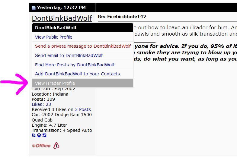 Can also get to iTrader for anyone by clicking their username, and then "View iTrader Profile". Or open their profile, copy their user number from the URL, open any user's itrader profile, delete the user number from the URL and paste the user number of the buyer/seller you're looking to feedback, hit enter and you're in their profile.
