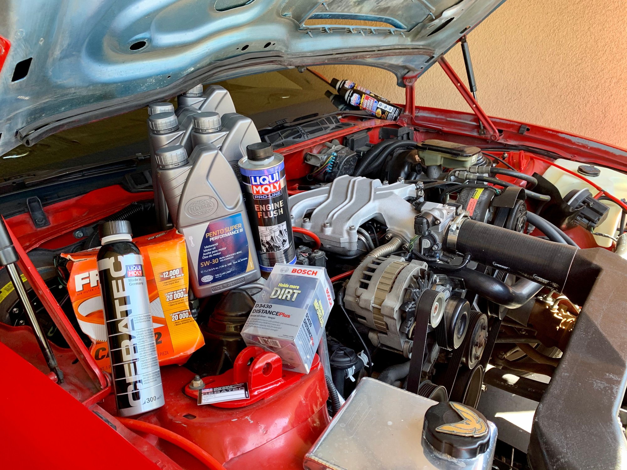 The Hood from my 1989 Formula 350 was swapped for a Fiberglass Cowl Induction Hood so I had that hood repainted in Bright Red VS White. I had originally provided the Auto Body Shop with SEM Hot Rod Satin Black which was FREE from Summit Racing but either they used it for something else or it was misplaced? The Hood spent a couple years (+3/4) at the Auto Body Shop and while I could have probably paid less since they lost my supplies, I felt it was right to redress for the passing of such a long period of time...