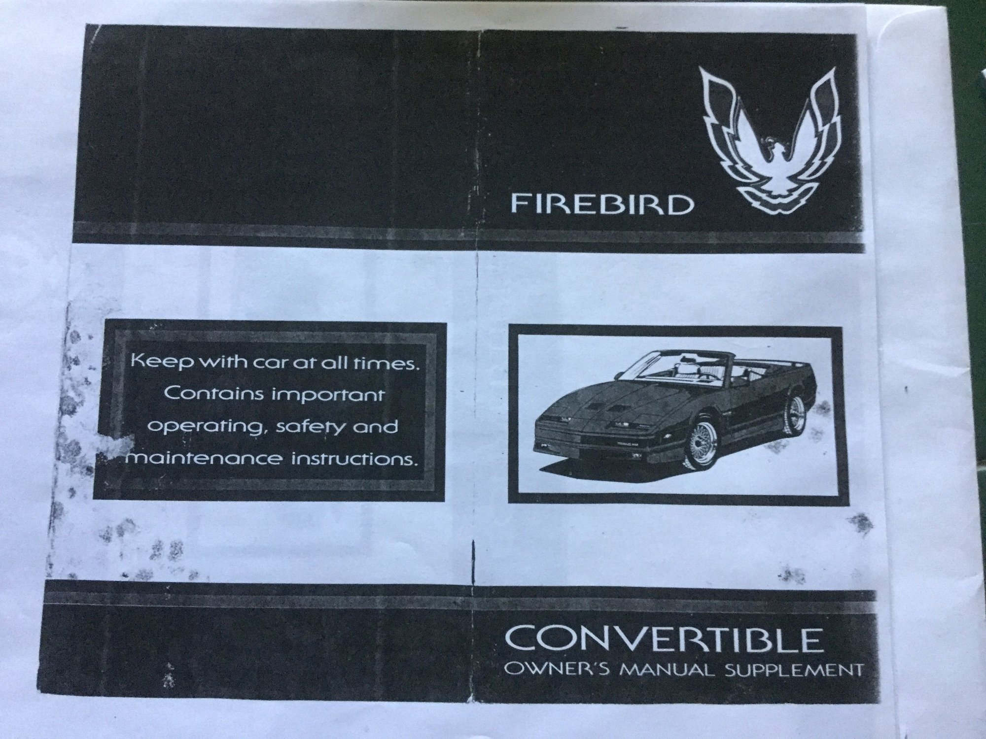 My buddy made me a copy of his Firebird convertible supplement when He had a 1988 Formula convertible.Pic of front and back cover.I also have pdf files of the 80’s and 90’s camaro convertible Supplement manuals that a tgo user sent me a few years back.