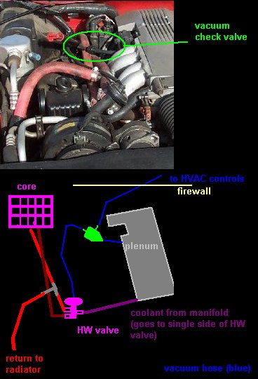 The way is is *supposed* to be is the coolant comes out the manifold, goes through the throttle body, and then goes to the plastic vacuum operated heater valve. From the heater valve, depending on whether vacuum is applied to it, the coolant runs to the heater, and then to the right bank of the radiator, or if the heater is off, it just runs right to the right bank of the rad.