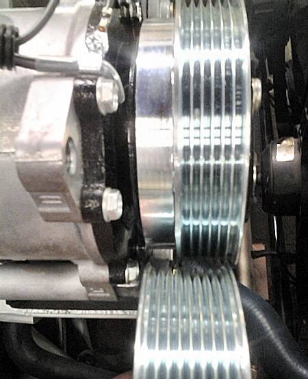 From what I can see, and darby may be better to answer where the belt lies (appears rearward in his pictures), the 6rib pulley is machined out to the front part. Basically it deleted the reward two ribs... if you were to just change pulleys, and used darbys brackets, the 1/4" difference would chuck a belt at startup.