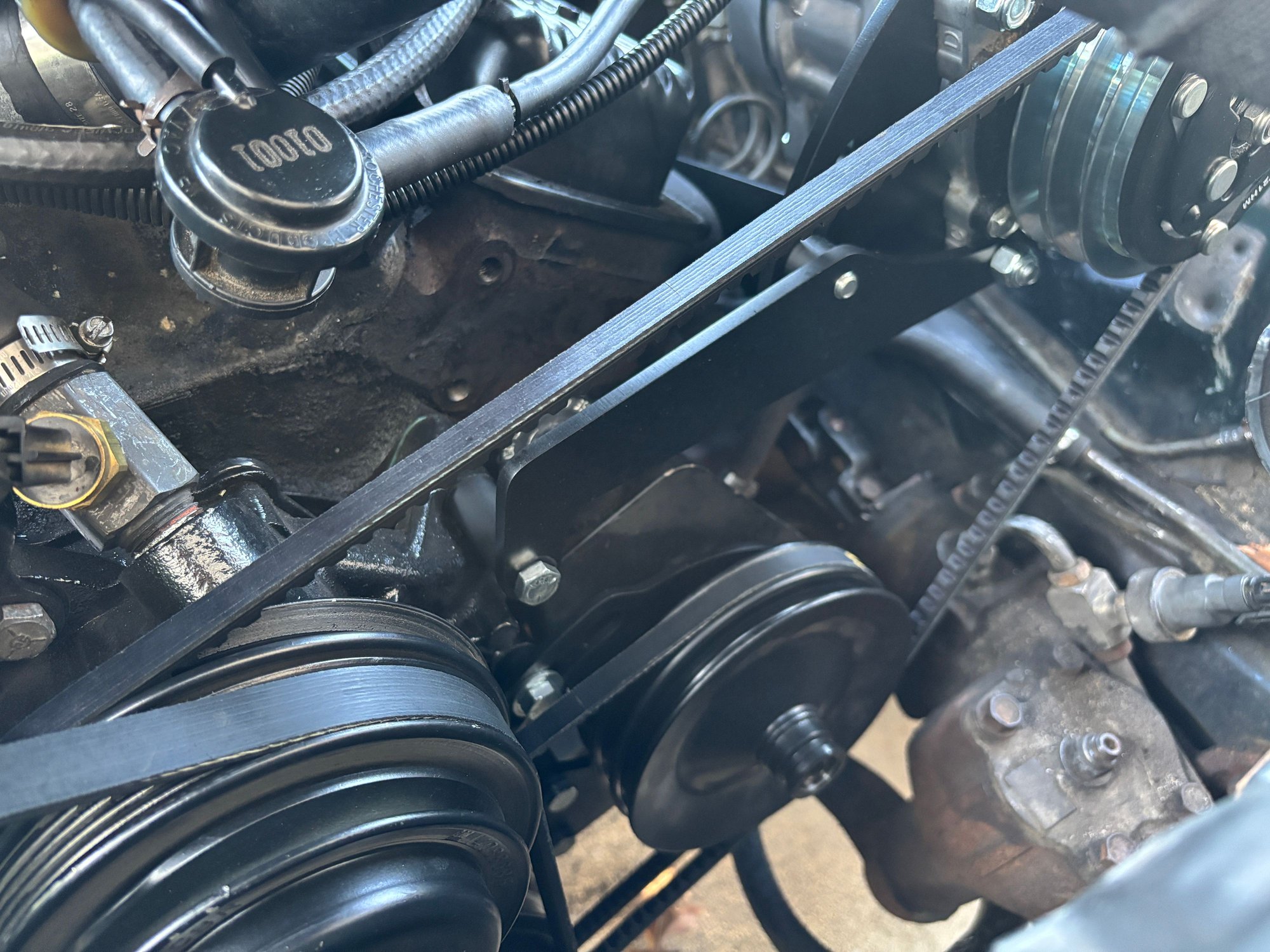 Good AC is a must for a daily driven in the South. After my 2nd R4 compressor on my 87 (v-belts) started leaking, I went ahead and upgraded to a Sanden. Already converted to 134a and installed a parallel flow compressor when I replaced the 1st R4. The Sanden 4860 is the same size as the 508, but has a GM style pad so I was able to reuse the factory hoses. Used Alan Grove bracket 119L. Fortunately I replaced my exhaust recently so getting the studs out was easy. Unfortunately the factory AC bracket is also used by the PS pump, so I swapped in an Alan Grove 402L for the PS. I did have to yank the PS pulley off to swap mounts. Much simpler design and cleans up the front end. Also makes it easier to fill PS fluid. Ended up using a 60” belt for the AC, and a 39” belt for the PS. The clutch switch is wired in parallel with the high pressure cutoff. I cut back to where it splits from the loom, sealed the black ground wire with adhesive lined heat shrink, then connected the green wire to the single green wire from the compressor. The compressor connector has an integrated ground and flyback diode. The compressor mounts farther toward the driver side, so I had to ditch the factory snorkel for an open air cleaner. Pulled a vacuum for 30 min, verified no leaks, then charged with about 2.5 12oz cans of 134a. AC blows ice cold. RPM drops only 100rpm from idle when the AC kicks on so I had to back off the idle kicker (ccc carb). While cruising, I don’t even feel the compressor kicking on, just hear the click of the clutch cycling.