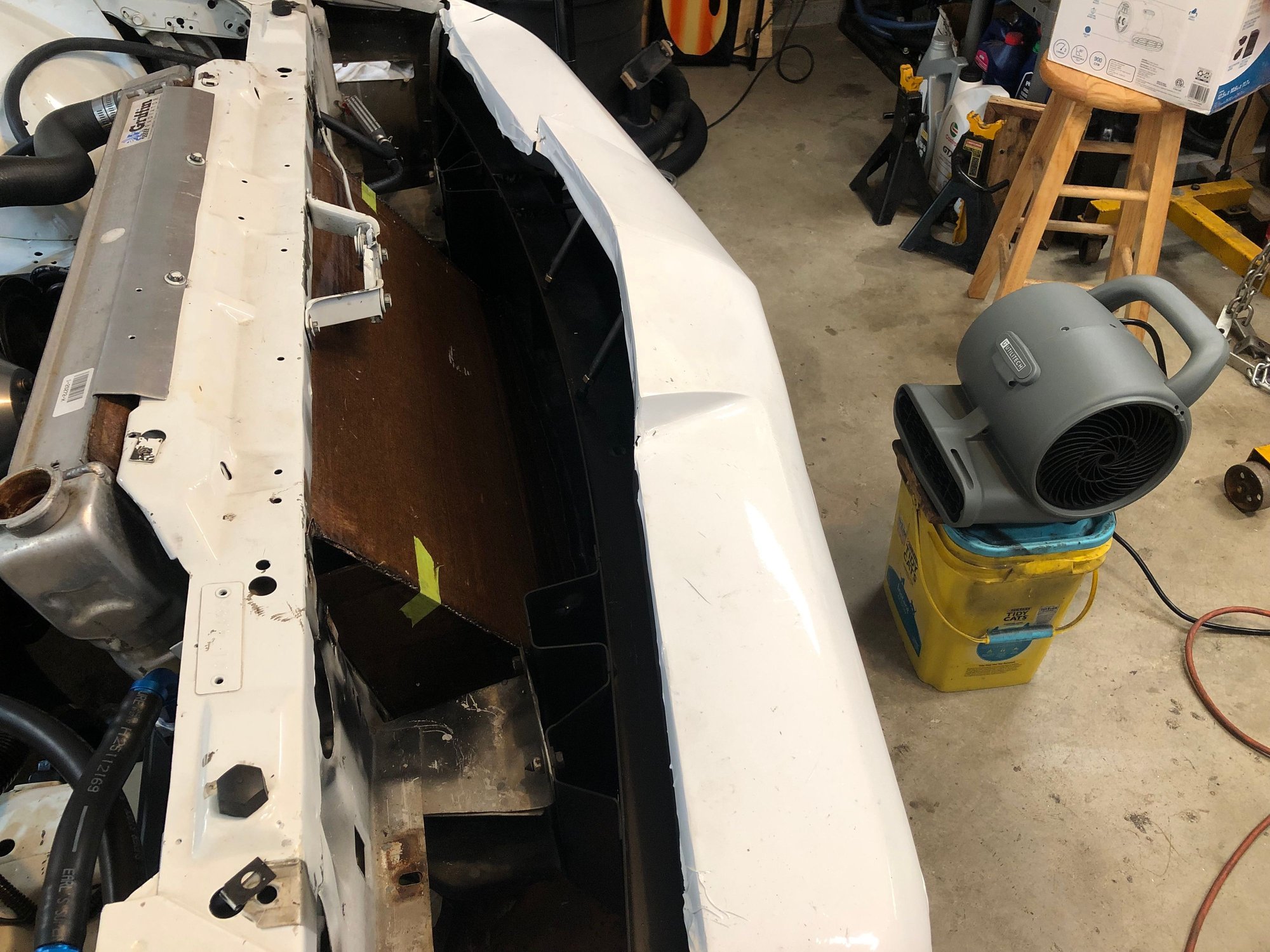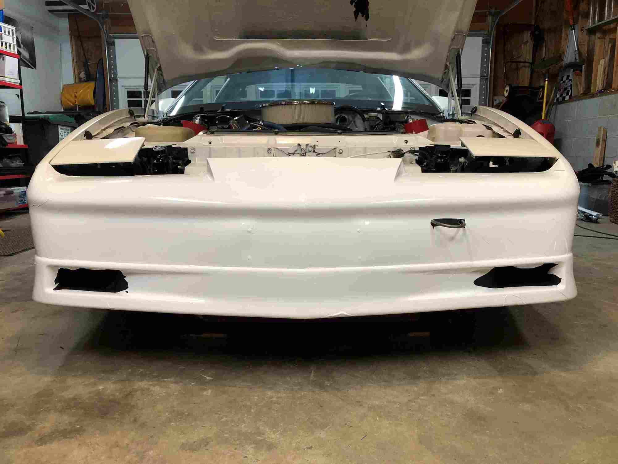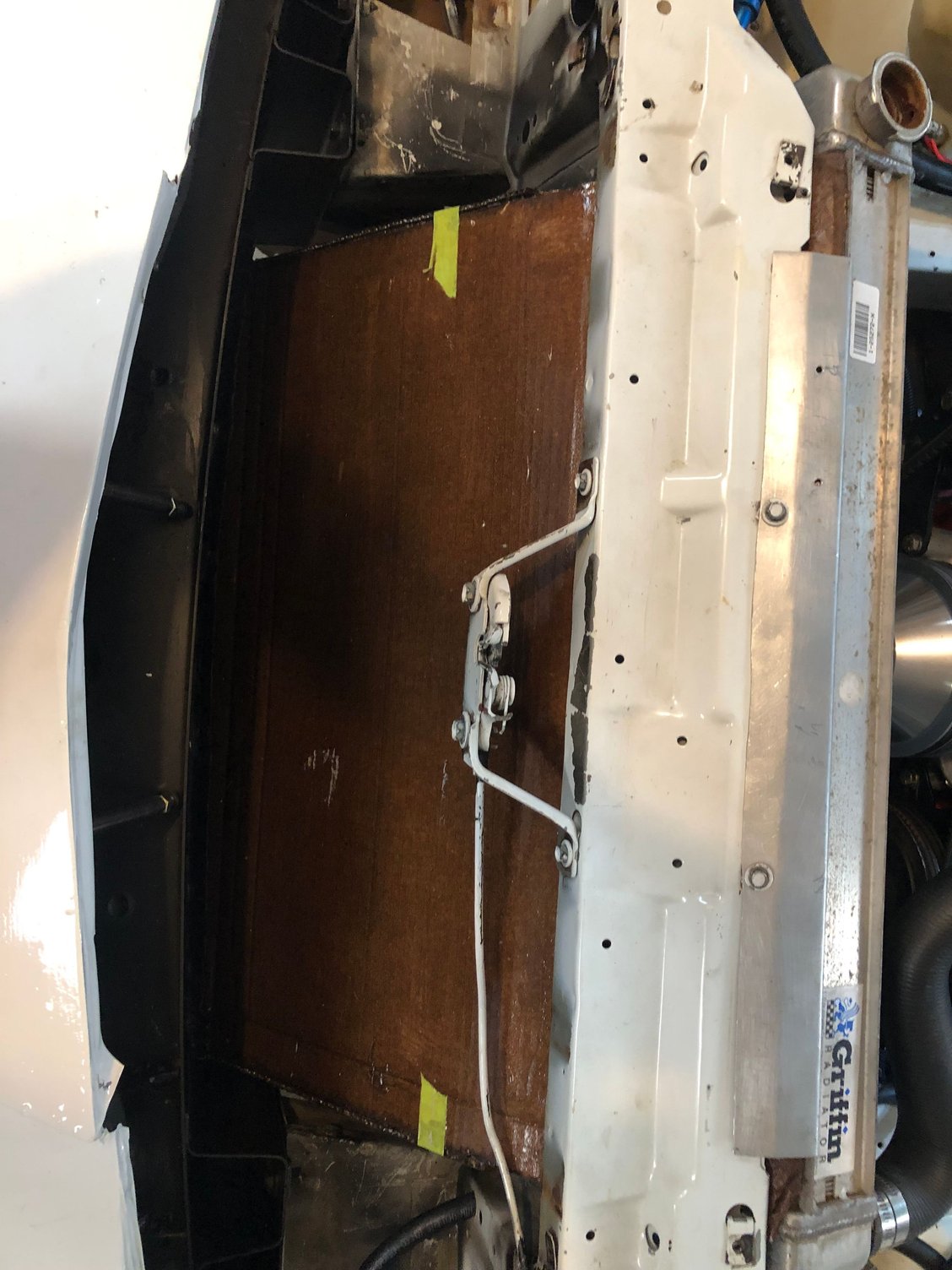 This is an 86 TA track only car. Right off the hop, that means there is lots of freedom in modifying or removing stuff. 350 with AFR heads, Victor Jr. intake, 248/248 solid lifter cam. The TA was tested last summer at Dominion and Summit Pt. and the motor overheated every session. We were trying to stay with the bottom feeder radiator inlet but have now gone to a front facing opening with ducting (not yet tested). The fabrication is rough and the spoiler looks like hell. It is my first attempt at forming ABS. The nose piece is fiberglass.