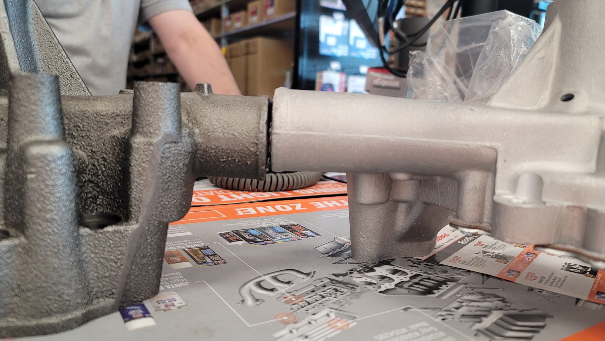 If you have a machine shop with a large belt sander, they could quickly zip a little off the mounting pads of the HV pump to get it to the same dimension as the original, no?