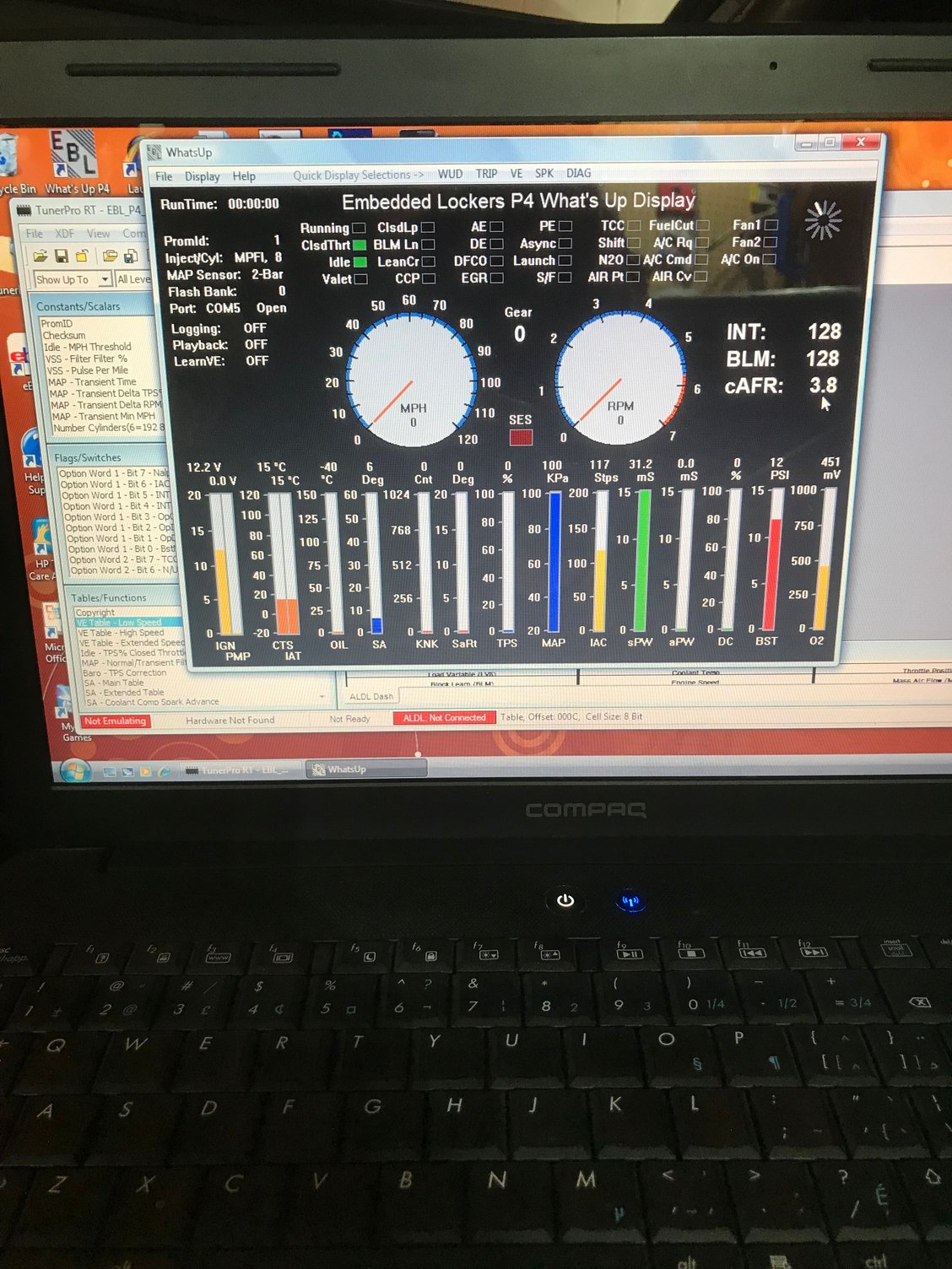 For sure the readings don't make sense. Doesn't take much to foul plugs with those big injectors, stock up. I have EBL Flash2 so might be different. Some simple stuff before the experts chime in: There's a BPC calc in the EBL Utility for mine, don't know about P4 did you do that? Also timing on the distributor (EST disconnected) set at at 6 degrees too?
