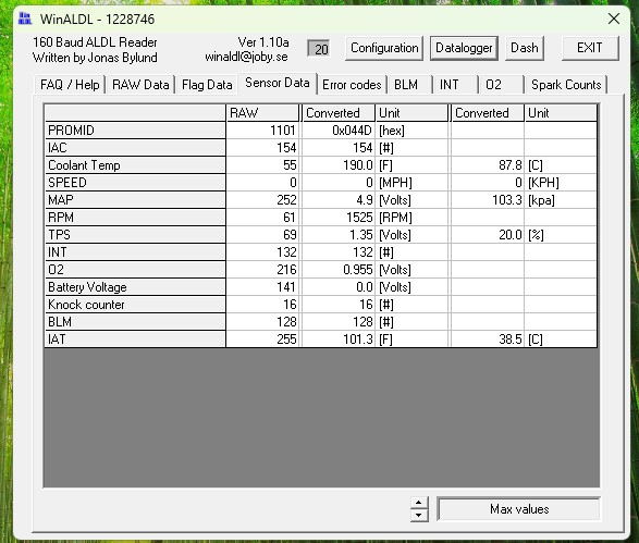 I did a quick log with winaldl on this 90 tbi I am putting back together. The biggest issue I am having at the moment is throttle response. I am only testing the car in park at the moment, still not road worthy yet. Throttle response upon quick stabs of the throttle yields delay and or back fire through the throttle body. I can slowly open the throttle and it responds fine. Timing is set at 2 degrees btdc with timing plug unplugged. I have reset the IAC based on the reset instructions, IAC seems fine. TPS has been tested, biggest problem with TPS is the lowest at idle Volts I can get it set at is 0.93 volts. Have tested 3 different TPS sensors and they all sit around the same voltage. Spark plugs and wires are new. I don't recall if the CTS was changed. The distributor, ICM, coil have not been replaced. I do not want to just buy parts, I want to determine what is causing the issue. Fuel pump and filter were just changed, fuel sits around 10psi and doesn't drop with throttle. I would appreciate if the tables I added here can be looked at and let me know if they are seeing problems in the data.