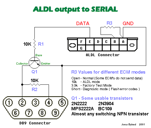 I was wondering if this cable (attached) will work with Craig's ECM850B and/or ECMV845? I am simply looking to monitor my car (1227165) on my laptop at this point. Will this cable make my ecm send at the optimal rate (8192) for an 87 ECM? Set me straight if I am going in the wrong direction to accomplish my goal. I plan on going to Radio Shack tomorrow to get the transistors and the switch. Is there anything in particular I need to know about the schematic before I go or I should ask for?