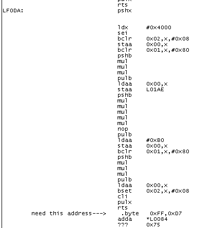 LC1F5: .byte 0x0F ; DRef: 0xE595 LC1F6: .byte 0x30 ; DRef: 0xF4B0 LC1F7: .byte 0x0C ; DRef: 0xD6D5 LC1F8: .byte 0x04 ; DRef: 0xED15 LC1F9: .byte 0x78 ; DRef: 0xED1C LC1FA: .byte 0x00,0xF0 ; DRef: 0xED0C LC1FC: .byte 0x01 ; DRef: 0xED21,0xED44 LC1FD: .byte 0x1D ; DRef: 0xED69 --------------------------------------------------------------------------------------------------- LC905: ldaa #0xFF ; CRef: 0xC8FE LC907: staa L0113 ; CRef: 0xC903 LC90A: ldaa L4005 ; CRef: 0xC7EC adda #0x02 staa L4006 ldx #0x4007 bset 0x00,x,#0x01 jmp LCC1A irqrtn: ldx #0x4007 ; CRef: 0xFFF2 brset 0x01,x,#0x01,LC98E brclr 0x00,x,#0x20,LC931 brclr 0x01,x,#0x20,LC952 bset *L0046,#0x08 jsr LFBB9 rti
