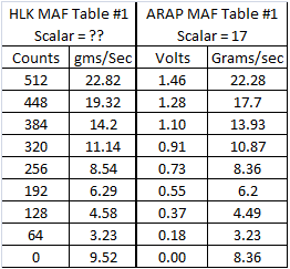 My question is how to find the conversion between "counts" and "volts" as they apply to the two MAF tables. For example, please see for MAF table #1, HLK vs ARAP: