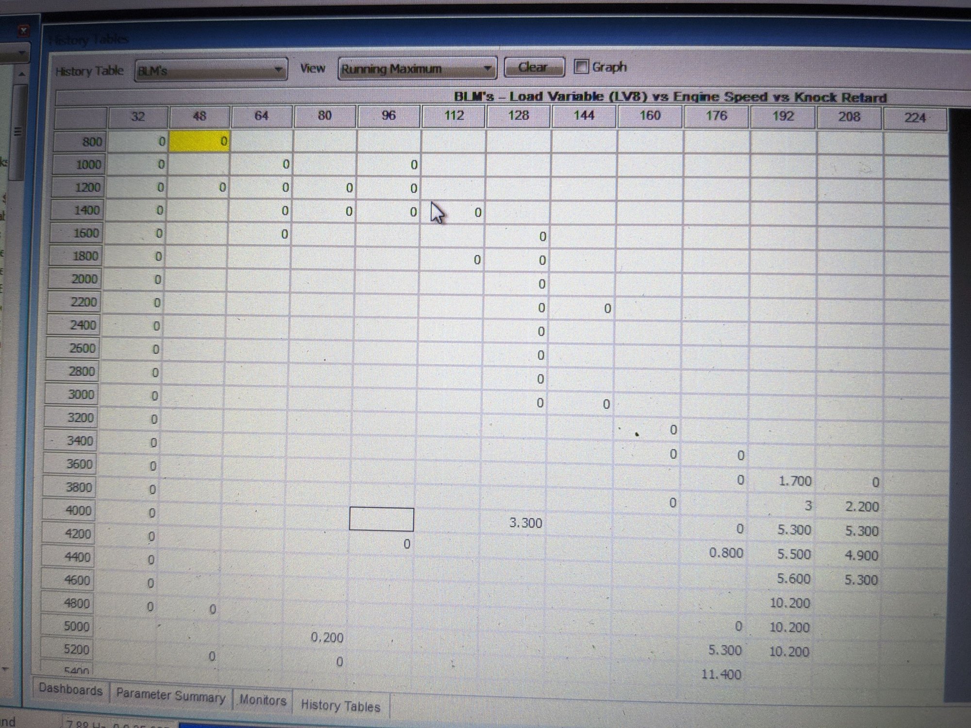 Can someone chime in on the tables below BLM,s history average, maximum and minimum along with a knock retard table. I getting up too 10 deg of retard above 4K rpm. I am assuming the tune is lean and needs more fuel. Is this correct?