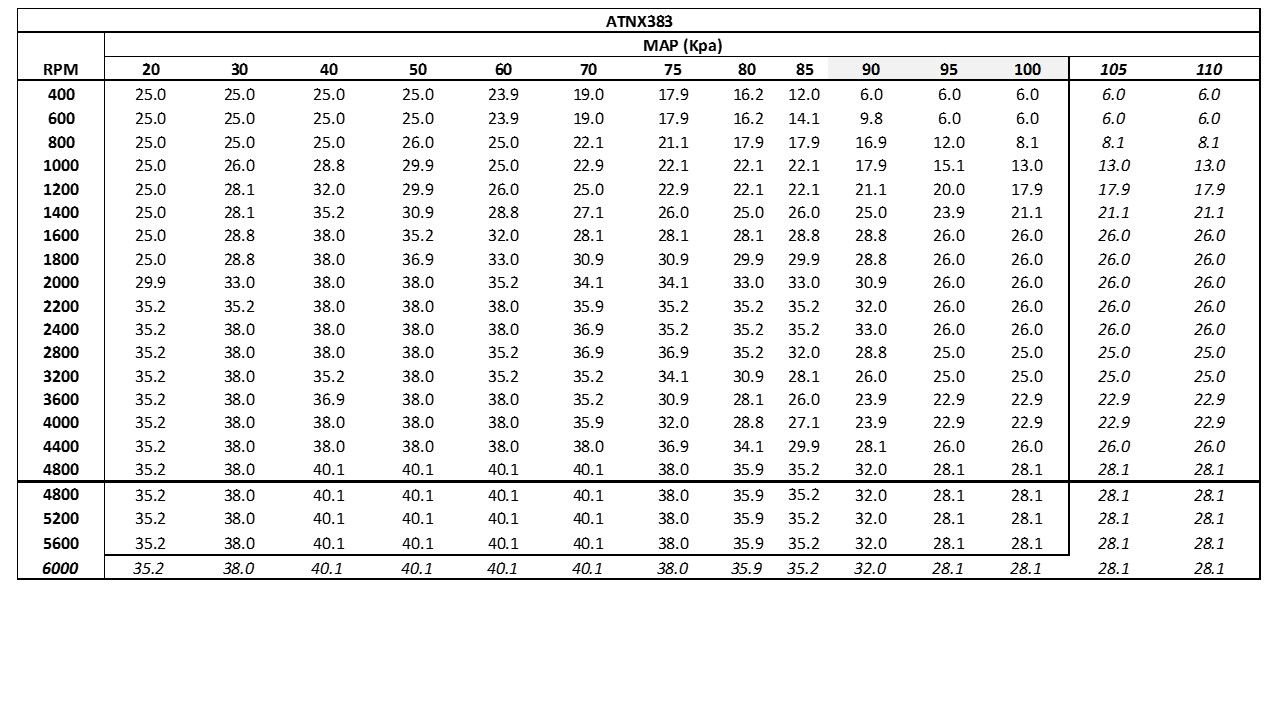 I set my all in MAP value to be 80+ kPa only and my increment to 0.0650* per 1 kPa increase.