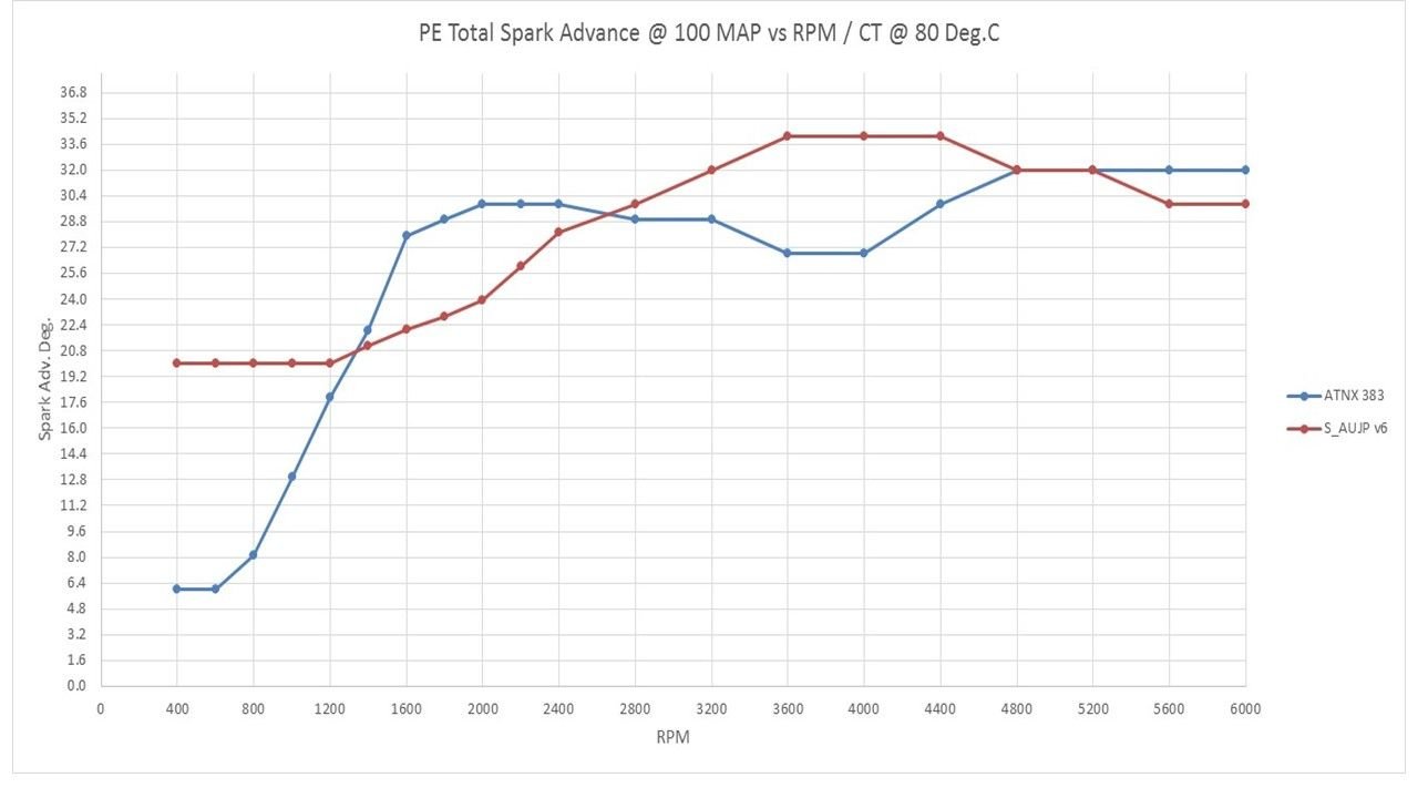 This is a graph at WOT for my 383 stroker (blue line). It is a copycat of OEM 305, TPI, 1991, Speed Density (7730), 5 speed, tune (ATNX). The main SA table is changing based on CT and PE. This example is at WOT at 176 Deg.F. I am waiting for the dyno next summer to tune the SA, so the graph most likely will change. The red line is S_AUJP v6 that circulates on Thirdgen.org. I believe it is for a 350CID with automatic transmission, but I have no other details. Basically, SA curve is specific to each engine. I have aluminium heads fast burn, so SA might not need as much advance.