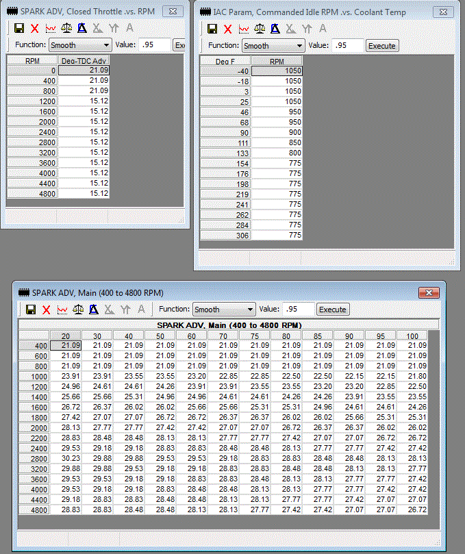 Help me out...where do you see "850-RPM in Park/Neutral, with 750-RPM as your base when fully warmed up."? I will try bumping spark advance up by about 6*deg. Spark Advance Closed Throttle Vs. RPM table...Right?