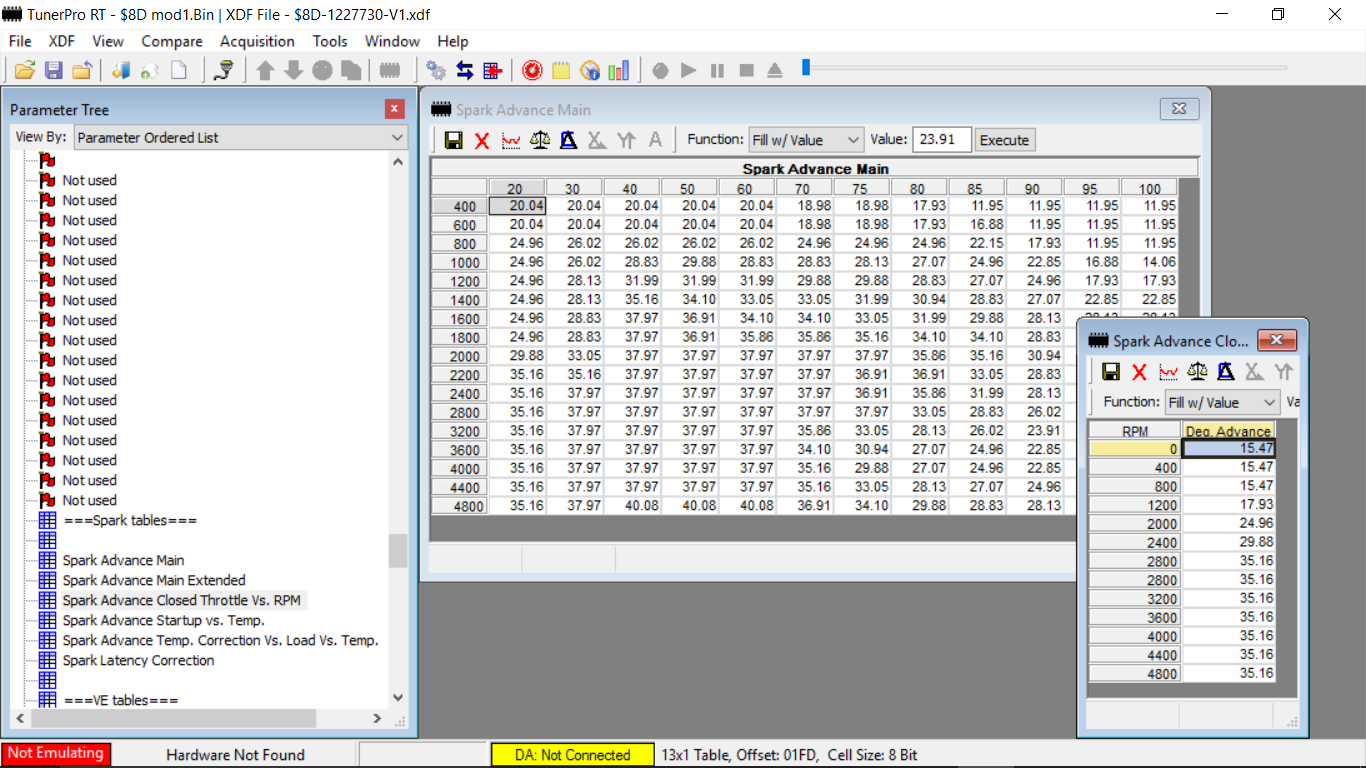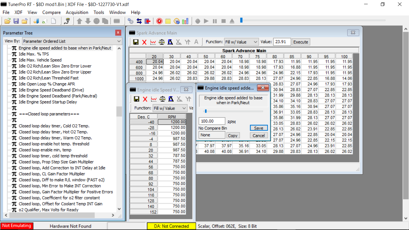 But this is important to understand. Explaining the spark issue another way -- Until a certain coolant temperature is reached, the SPARK ADV, Closed Throttle .vs. RPM Table is NOT USED when idling. Rather the spark used is that in the 100 kPa column of the Main Spark Table, based solely on RPM. MAP kPa does not matter. There is nothing you can do about this for now. The Scalar in your XDF that determines the temperature at which the table change is made is: "Spark Advance Cold Disable Temp", which is =50*C or 122*F in your BIN. DON'T CHANGE THIS unless you know what you are doing.