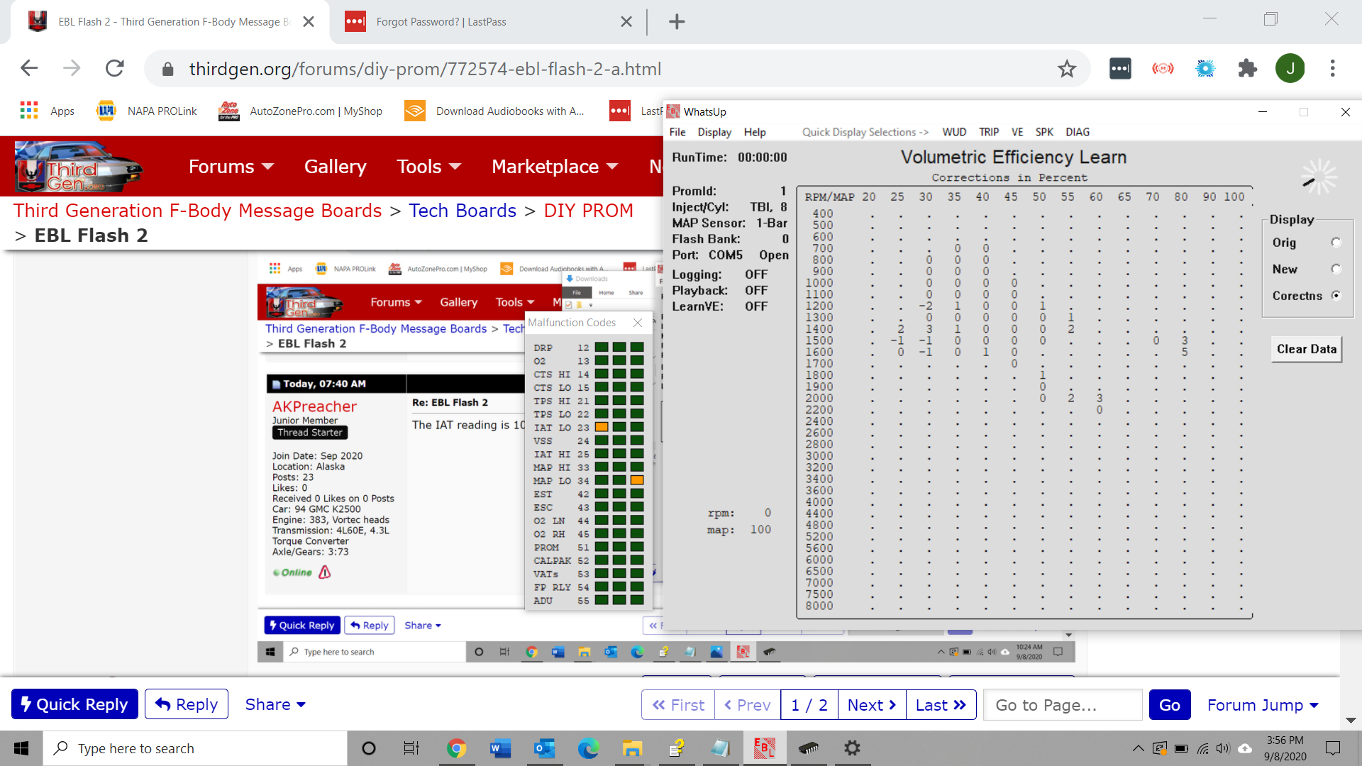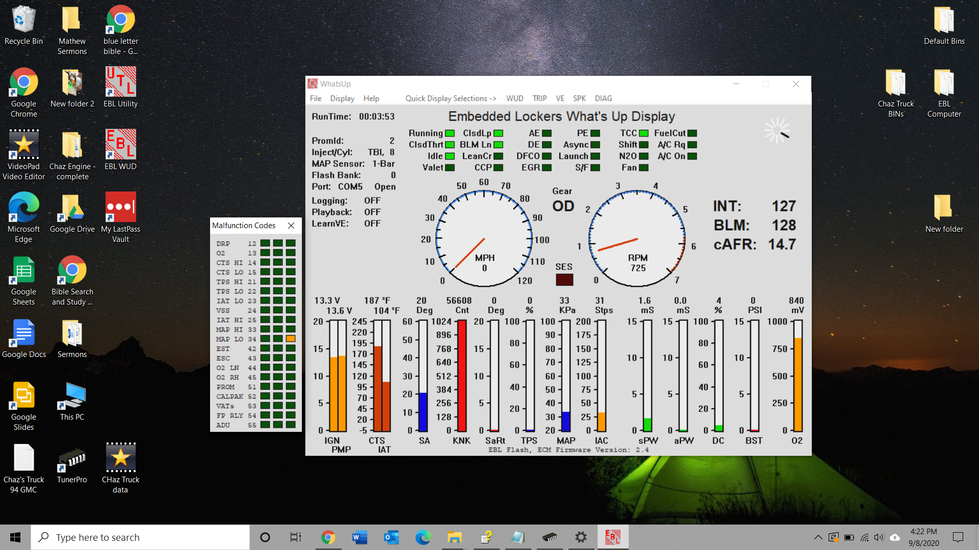 Now, remember, we haven't even started tuning yet. All we're doing is putting together a base to get you started, and once that was/is done, we would have you start a VE Learn session right away. But you can't do one as of yet because of the malfunction codes. Do not worry about the engine running rich right now, it is honestly irrelevant at this point because the engine is not tuned yet. Just focus on getting those hard malfunction codes resolved so the VE Learn can commence. One you start your first VE Learn and feel the difference, you will understand. Until then though, where do the malfunction codes stand...?