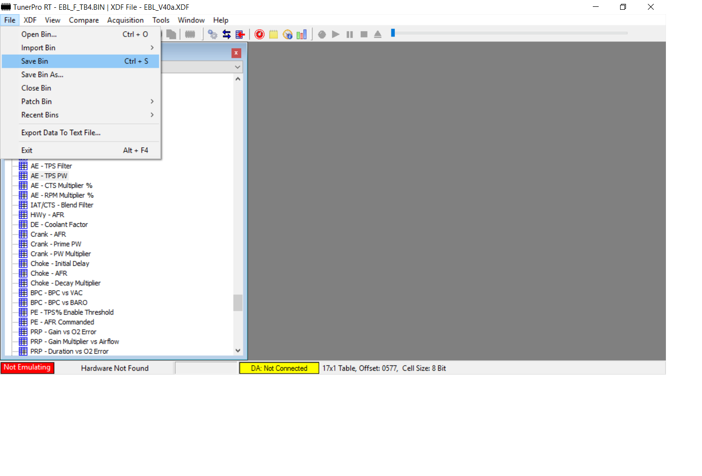 * After you click on the floppy disk (save) in each pop up, they will then disappear. You made the changes, however you need to finalize the saved work in the bin you are using. Click on File on the top left in Tuner Pro (see pic below), then click on Save Bin which is highlighted below...