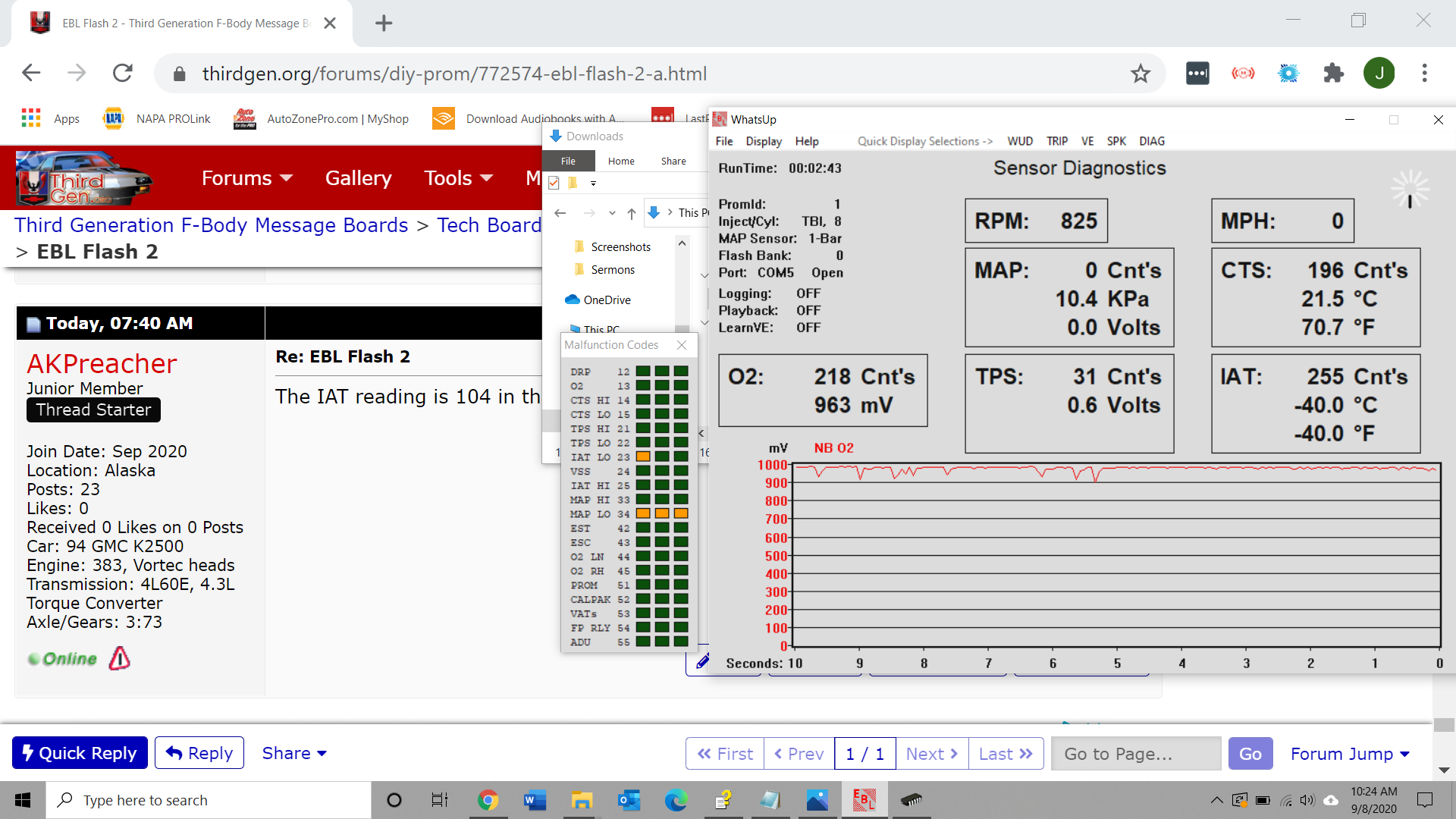 I can't see which IAT sensor malfunction code is blinking because the image grab didn't catch it. I am assuming it is IAT High 25 because it looks like the IAT on the WUD is 184 degrees, though it is very hard to make out when I zoom in on the picture, and it might only be 104 degrees, so I would need you to clarify that. Need to confirm with Bob if that malfunction code, as well as the pulling of the timing itself on the WUD screen is only a byproduct of the EBL algorithm, and that it is not actually happening because the original ECM is controlling the ESC, and the system has no IAT. But then again it is actually happening on the EBL side because your spark advance is being pulled down to 7* at idle, so the algorithm is causing that, not any knock sensor. So now we need to figure out why the EBL is setting those codes with no actual control, as well as those parameters being unchecked, and it's usually due to other data being presented.... so here is where we need to look at why your MAP Lo 34 is being triggered. During idle at 45 kPa, and 750-RPM, which is good. Although the WUD is showing kPa at 45, and your TPS at 0, toggle over to the WUD Diagnostic screen (up top, where it says DIAG), and tell me what your MAP and TPS volts are...