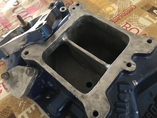 I had a GMPP manifold on first and Tbichips told me that was a restriction that cost me 20 hp. I don,t see anybody who has done flow testing on these manifolds so I'm having to take others opinions. This can get expensive. I have 500+ dollars invested between both manifolds. This is what I did to the manifold and adapter when I built the engine. I opened up the ports on the Edelbrock to match the intake gaskets, this was done to the heads as well. I opened up the top of the manifold and the holly adapter to the edges of the gaskets and just a little farther under the adapter so there were no obstructions between the tbi unit and the manifold passages. Using a die grinder I removed any sharp edges and shaped the adapter to a smoother more channeled surface. I left the dimpling from the die grinder because polished surfaces are thought to create drag. I opened the Holly adapter to make room for the throttle plates to clear. The Edelbrock manifold is a four barrel manifold, so I believed Tbichips when he suggested this manifold and adapter combo. I am lost how to choose the best manifold.